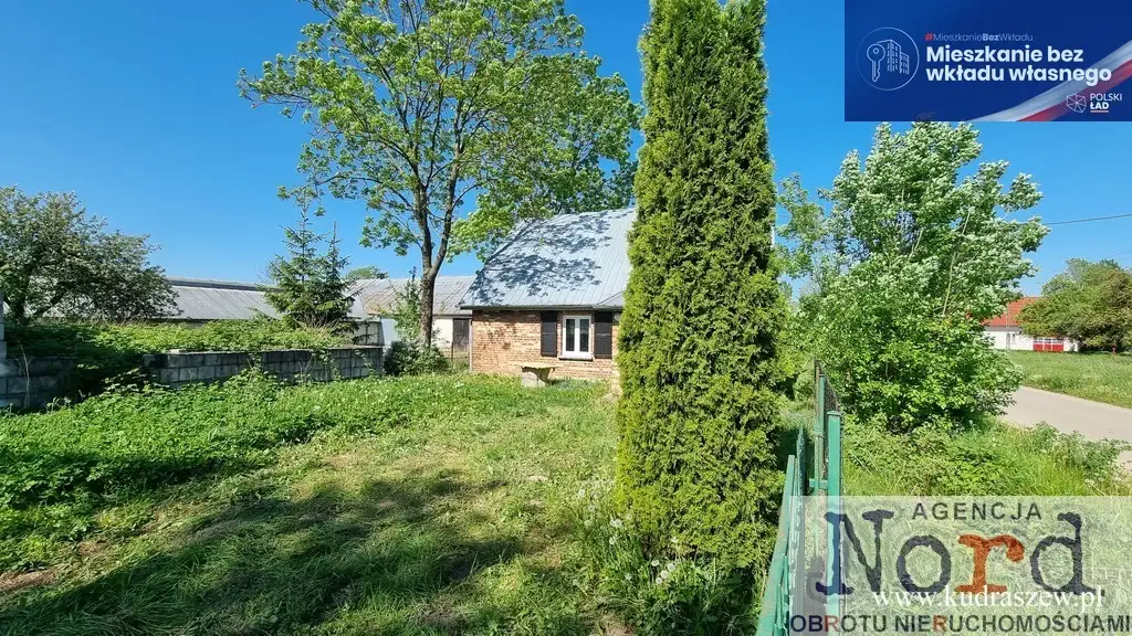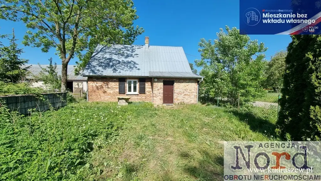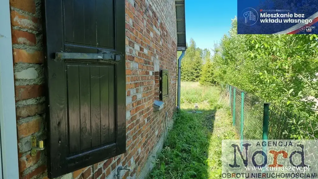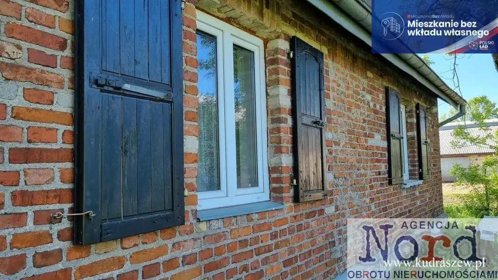 Nieruchomość zabudowana domem murowanym z pięknej, starej czerwonej cegły. Budynek mieszkalny o powierzchni ok. 68 mkw. Na parterze budynku znajduje się salon z aneksem kuchennym, dwie sypialnie, łazienkę oraz odrębne WC. W pokojach na podłogach położono panele. Okna PCV.