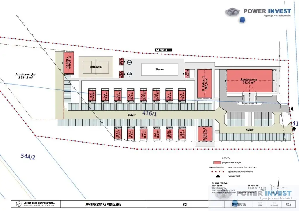 restauracja: 512 m²budynki rekreacyjne: 200 m² i 100 m²budynek gospodarczy: 105 m²14 domków wypoczynkowychwydzielone miejsce na bar, spa, saunę oraz basen120 miejsc parkingowychPodsumowanie: