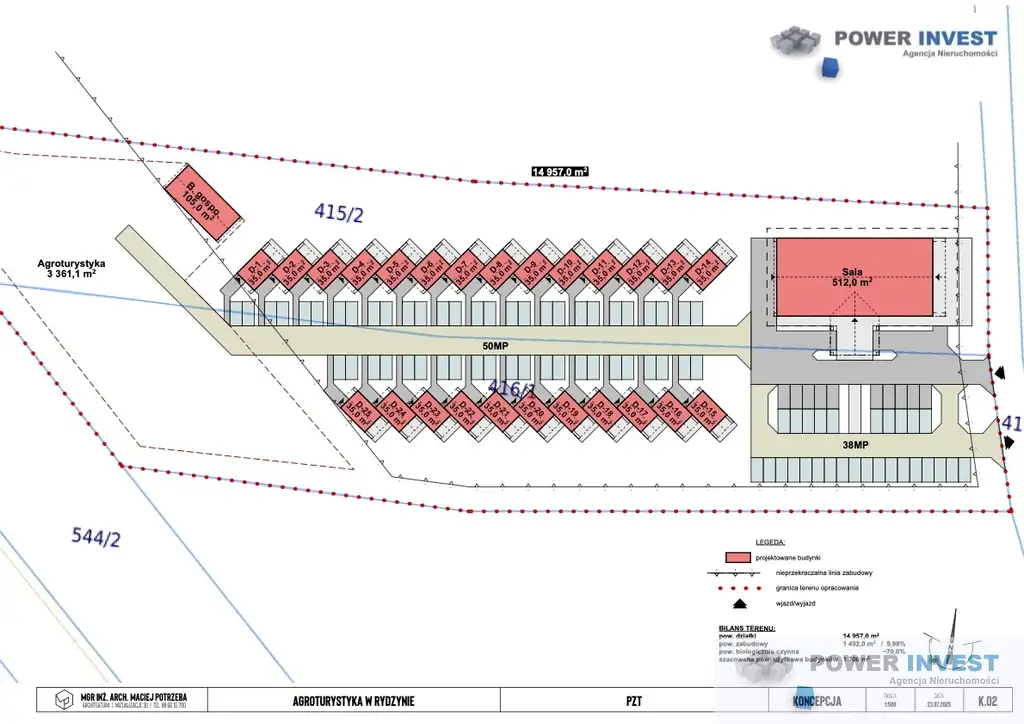 sala obsługi: 512 m²25 domków wypoczynkowych – każdy po 35 m²budynek gospodarczy: 105 m²88 miejsc parkingowychWariant 2