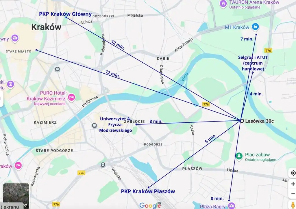Widok z każdego okna rozpościera się na zieleń - wały wiślane, ścieżki rowerowe, łąki. To jedyne mieszkanie na najwyższym piętrze w tym układzie. Dodatkowym atutem jest brak możliwości zabudowy terenów zielonych wchodzących w obręb Parku Rzecznego "Ogrody Płaszów".