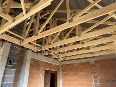 Dom wykonany z pustaka ceramicznego Cerpol, więźba dachowa wykonana z drewnianych wiązarów kratowych, dach kryty dachówką ceramiczną Creaton.