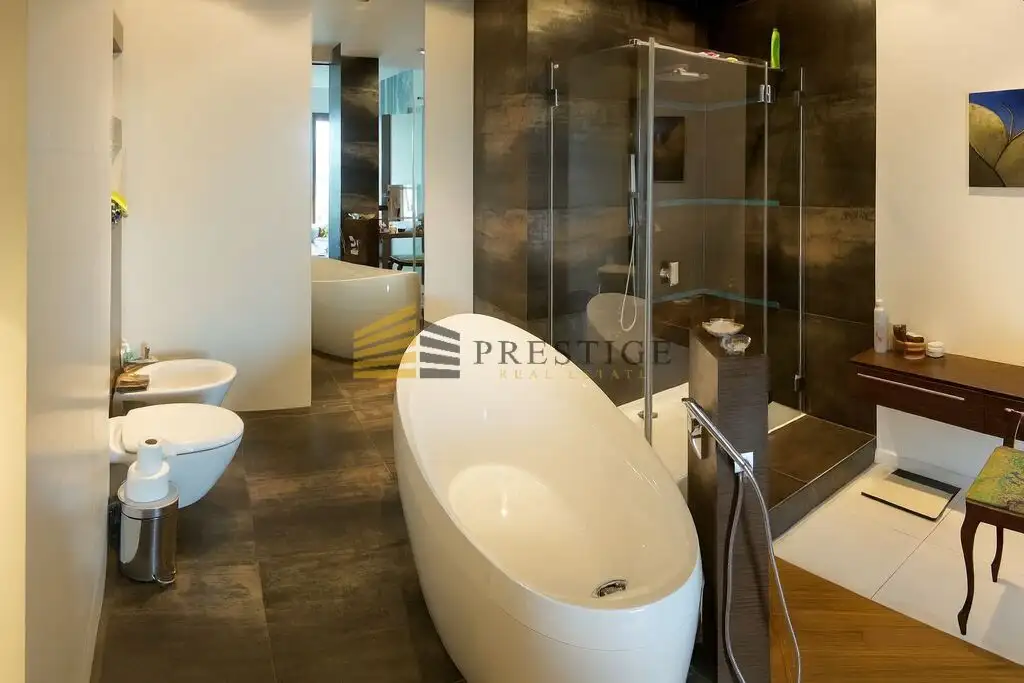 The apartment was designed with exceptional attention to detail, using top-quality materials. Bright colors, ample glazing, and an open-plan living area lend the space elegance and harmony. The interior is fully furnished and move-in ready.