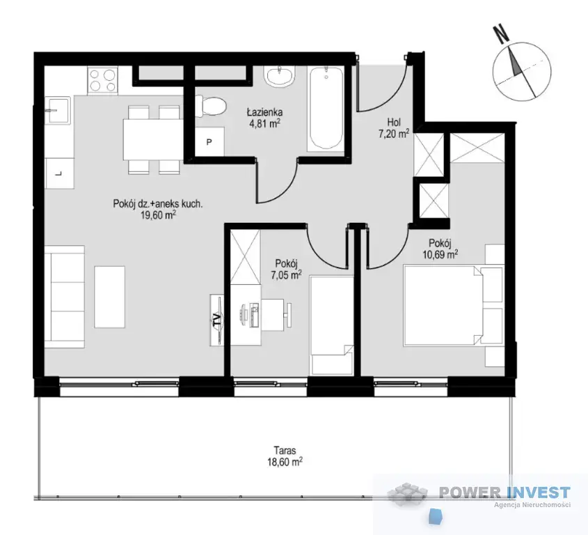 Mieszkanie znajduje się na 5 piętrze. Lokal ma powierzchnię 49,35 m² i składa się z: