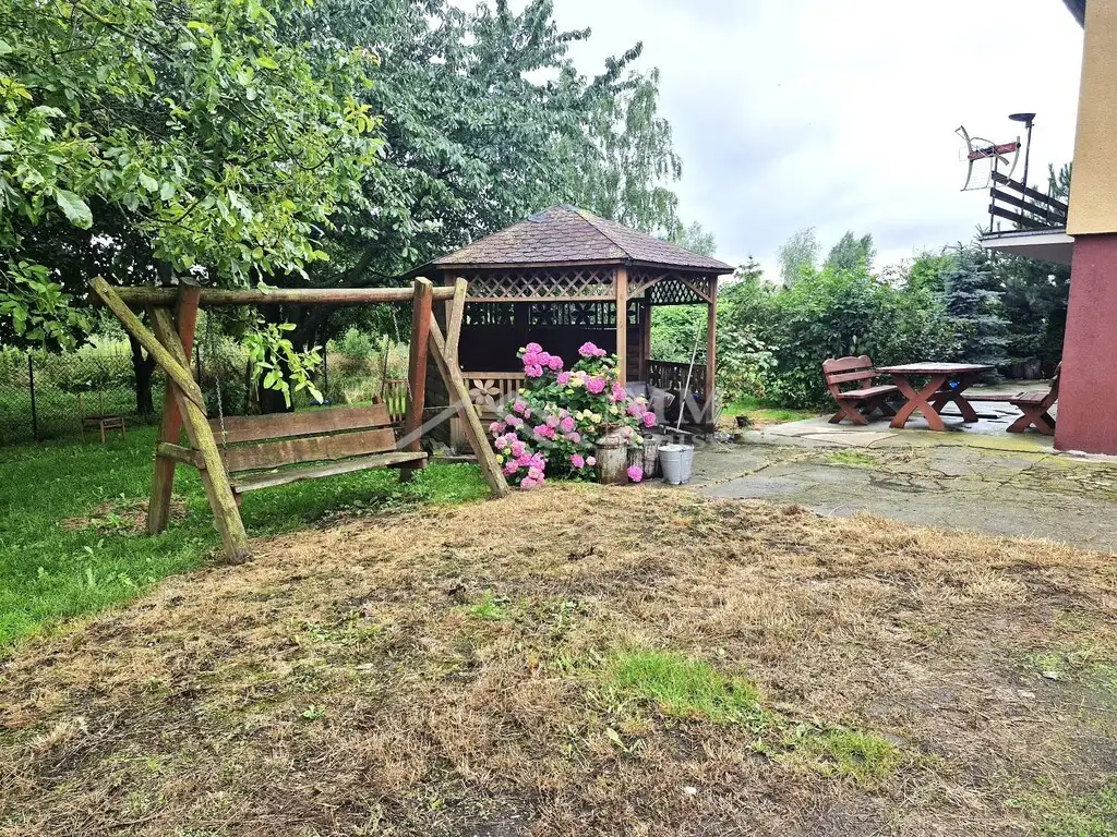 Wokół domu rozciąga się ogród z wygodną strefą relaksu i wypoczynku, w którym znajduje się wiata oraz miejsce na grilla i ognisko — idealne na wspólnie spędzany czas z rodziną.