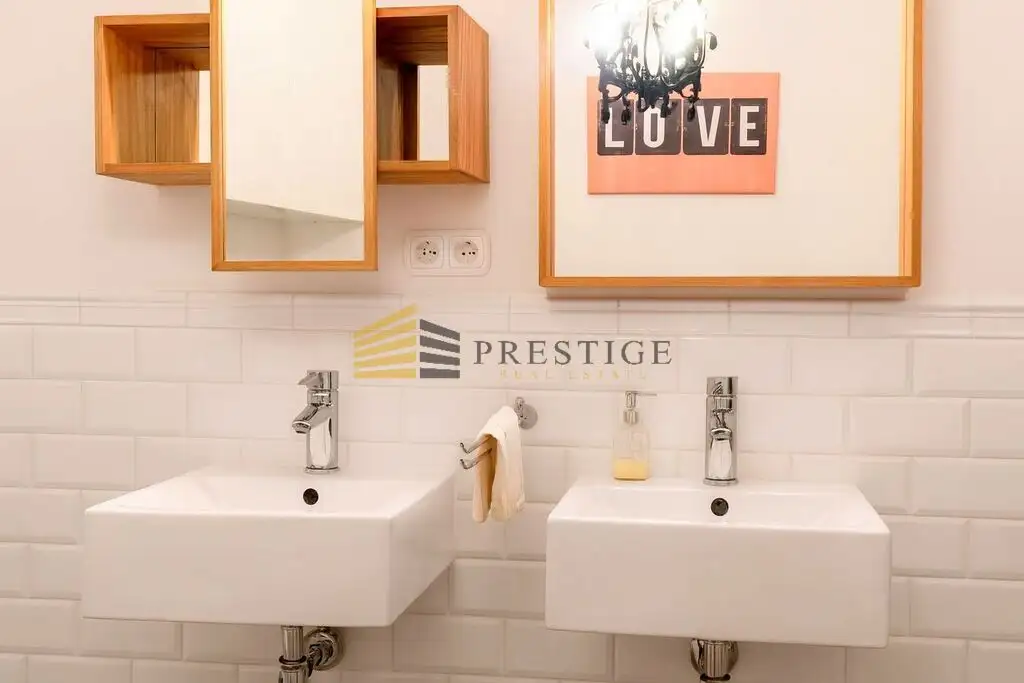There are only two apartments on the floor.3 bedrooms. 2 baths. Fully furnished. Bed linens and tableware included.Newly installed air conditioning. Washer and dryer.Two full bathrooms.The apartments provides unobstructed, beautiful views of the city.All rooms (also the kitchen) have an access to a balcony.