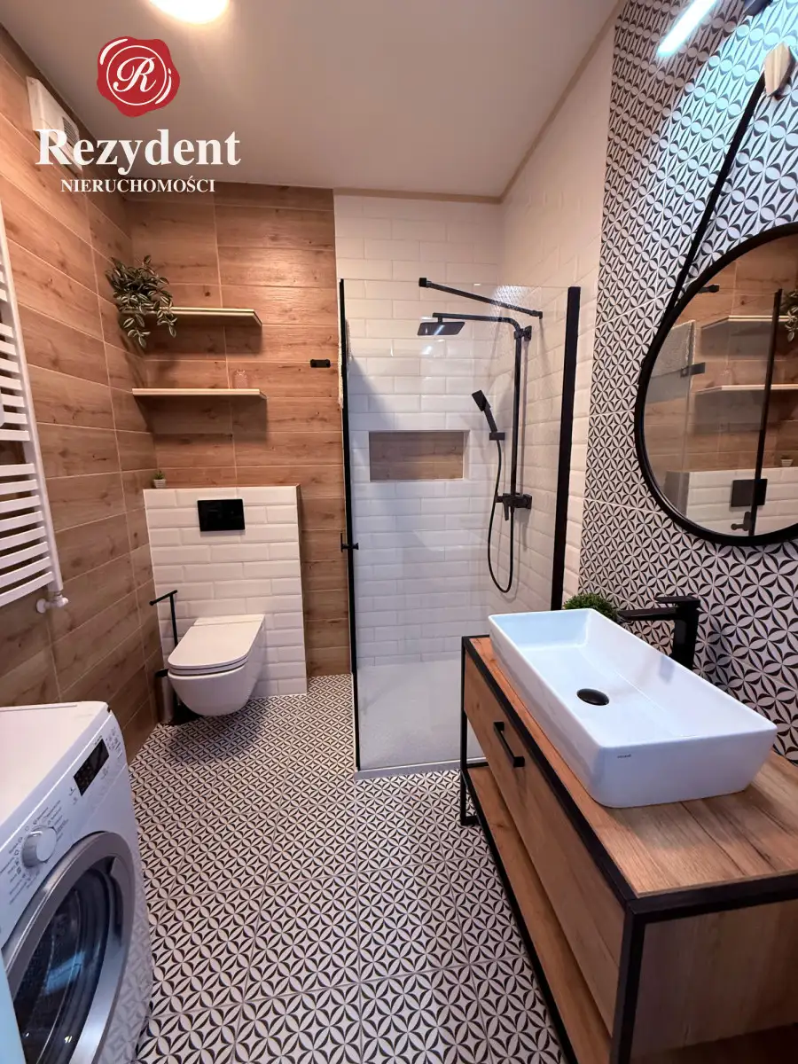 - łazienka - około 4,2m² - wyposażona w kabinę prysznicową, umywalkę, WC oraz pralkę i szafkę łazienkową