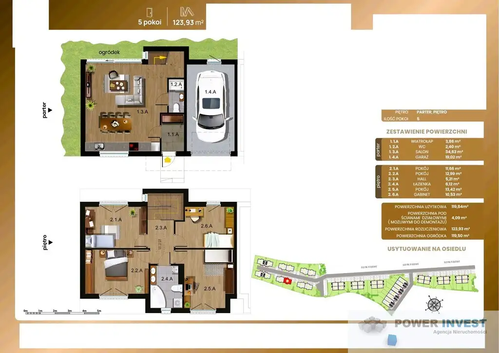 - Parter: wiatrołap, toaleta, przestronny salon z dostępem do ogrodu, garaż