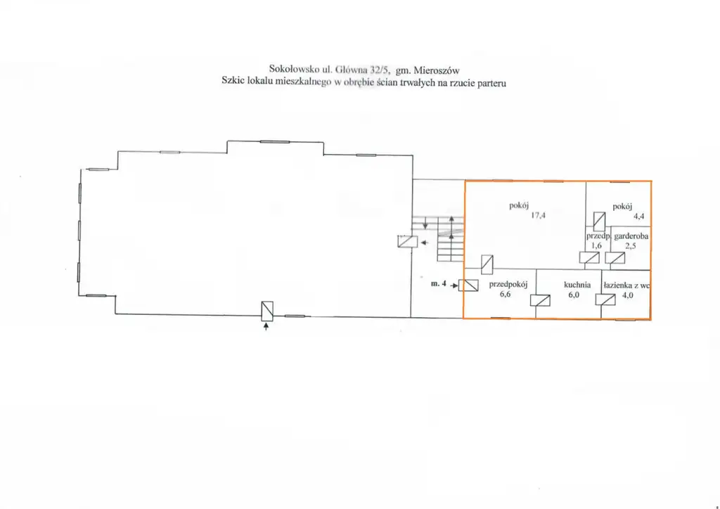 Samodzielny lokal mieszkalny nr 4, położony na parterze budynku w Sokołowsku przy ulicy Głównej 32. Mieszkanie składa się z dwóch pokoi, kuchni, dwóch przedpokoi, WC i garderoby o łącznej powierzchni użytkowej 42,50 m². Lokal nie posiada pomieszczeń przynależnych. Lokal wyposażony jest w instalację elektryczną, wodno-kanalizacyjną sprawne, ogrzewanie CO indywidualne na paliwo stałe (rury miedziane grzejniki płytowe) źródło ogrzewania mieszkania do wymiany. Stolarka okienna PCV (okna okratowane) w stanie średnim, stolarka drzwiowa płytowa przesuwna o wysokim stopniu zużycia, drzwi wejściowe metalowe (stan dobry), podłogi: w dużym pokoju i dużym przedpokoju wykładzina PCV, w małym pokoju deski w pozostałych pomieszczeniach płytki barwione (wysoki stopień zużycia). Wyprawy wewnętrzne − tynki cementowo-wapienne - płyty gipsowo-kartonowe malowanie emulsyjne zawilgocone miejscowo porażone grzybem z ubytkami, w kuchni i WC ściany częściowo wyłożone płytkami ceramicznymi . Stan techniczny i standard lokalu mieszkalnego określono jako zły.