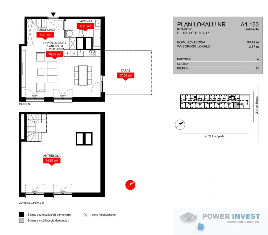 Mieszkanie znajduje się na 12 piętrze. Lokal ma powierzchnię 93,44 m² i składa się z: