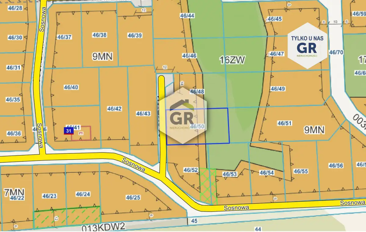Działka znajduje się na terenie objętym planem zagospodarowania przestrzennego. Ponad połowa działki (660 m²) znajduje się na terenie oznaczonym jako 9MN - zabudowa jednorodzinna (powierzchnia zabudowy do 30%, 2 kondygnacje naziemne, w tym poddasze, wysokość zabudowy do 9m, dach dwuspadzisty. Pozostała część działki to tereny zielone 16ZW, na którym istnieje możliwość budowy altany o pow. do 20 m² wysokości do 4 m.
