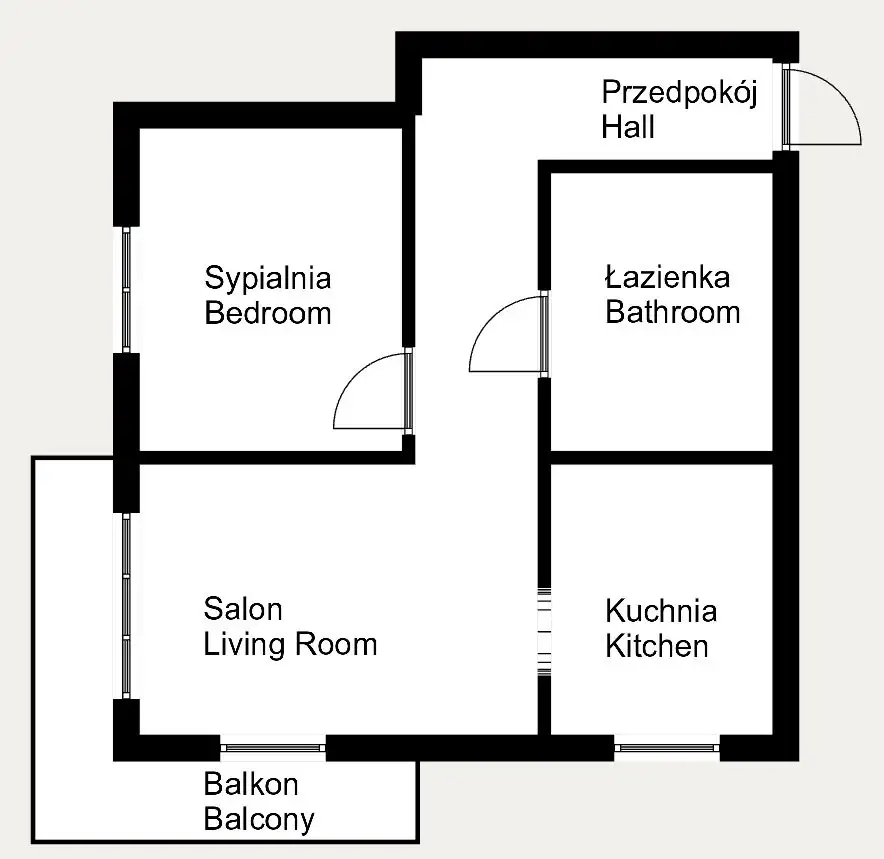 Pokoje: sypialnia, salon, kuchnia, przedpokój, łazienka, balkon