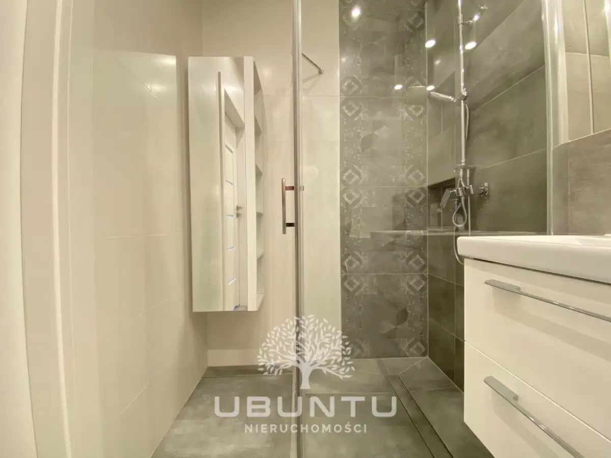 -Łazienka wyposażona w prysznic, szafki, umywalkę i toaletę (bez pralki).