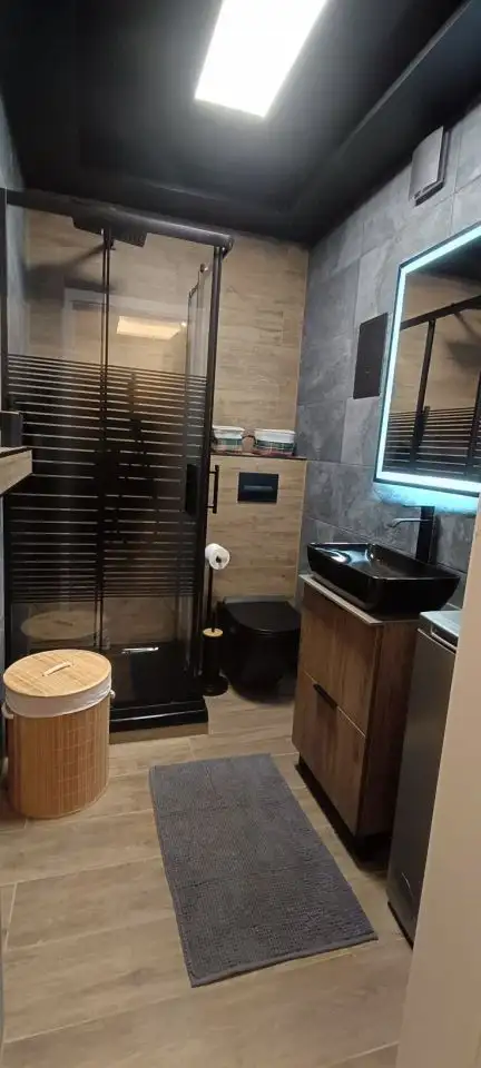 Stylowa łazienka z czarnym gresem i podświetlanym lustrem, w pełni wyposażona.