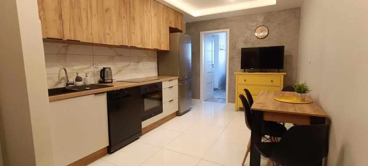 Nowoczesna kuchnia w pełni wyposażona w szafki, sprzęt AGD (lodówka, pralka, zmywarka) oraz stół.