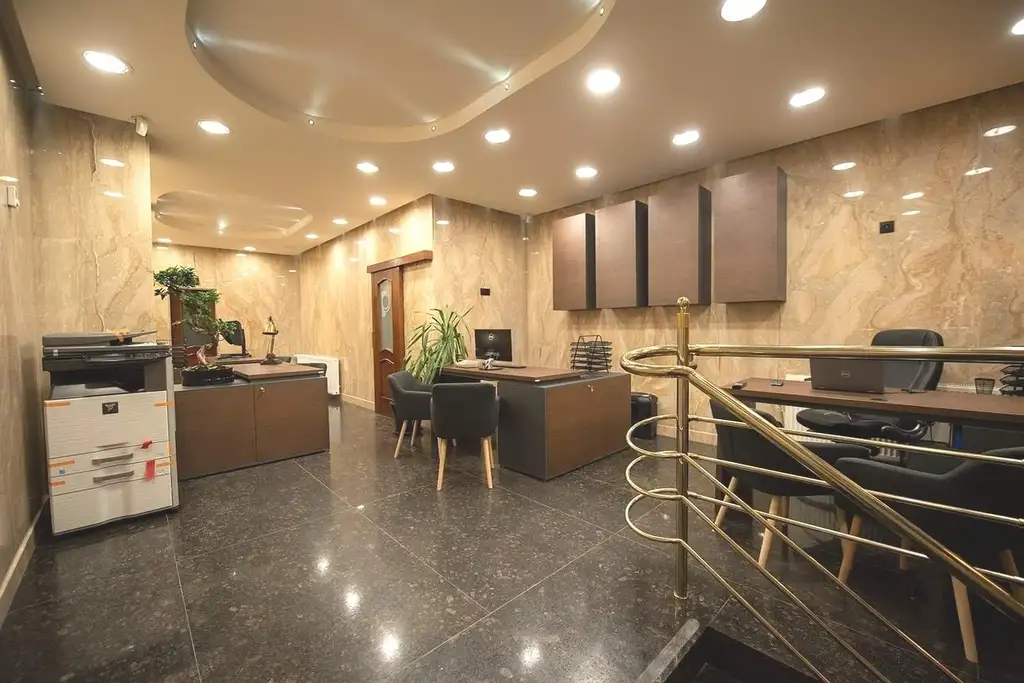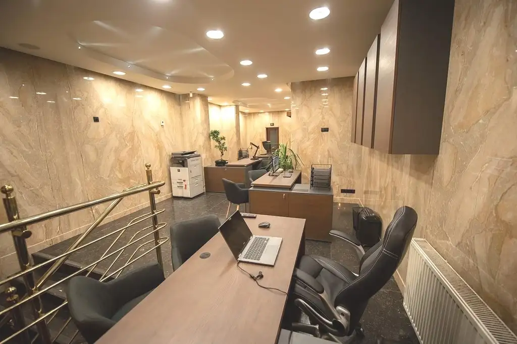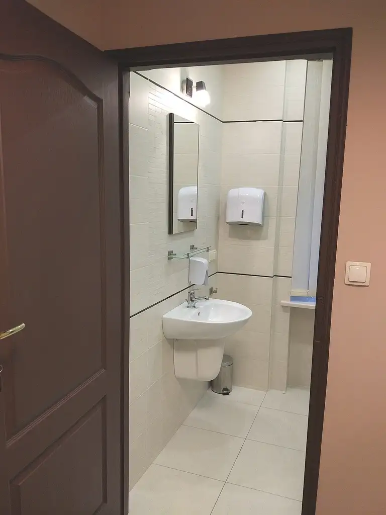 Opis : lokal w wysokim standardzie wykończenia, posadzki oraz ściany w sali głównej wyłożone płytami marmurowymi, pomieszczenia socjalne i wc - w kaflach.