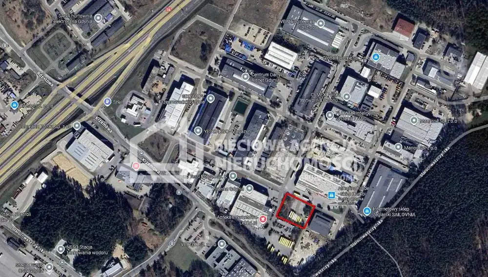 Działka jest płaska, utwardzona, ogrodzona z bezpośrednim wjazdem od ulicy głównej, blisko terenu przemysłowego.