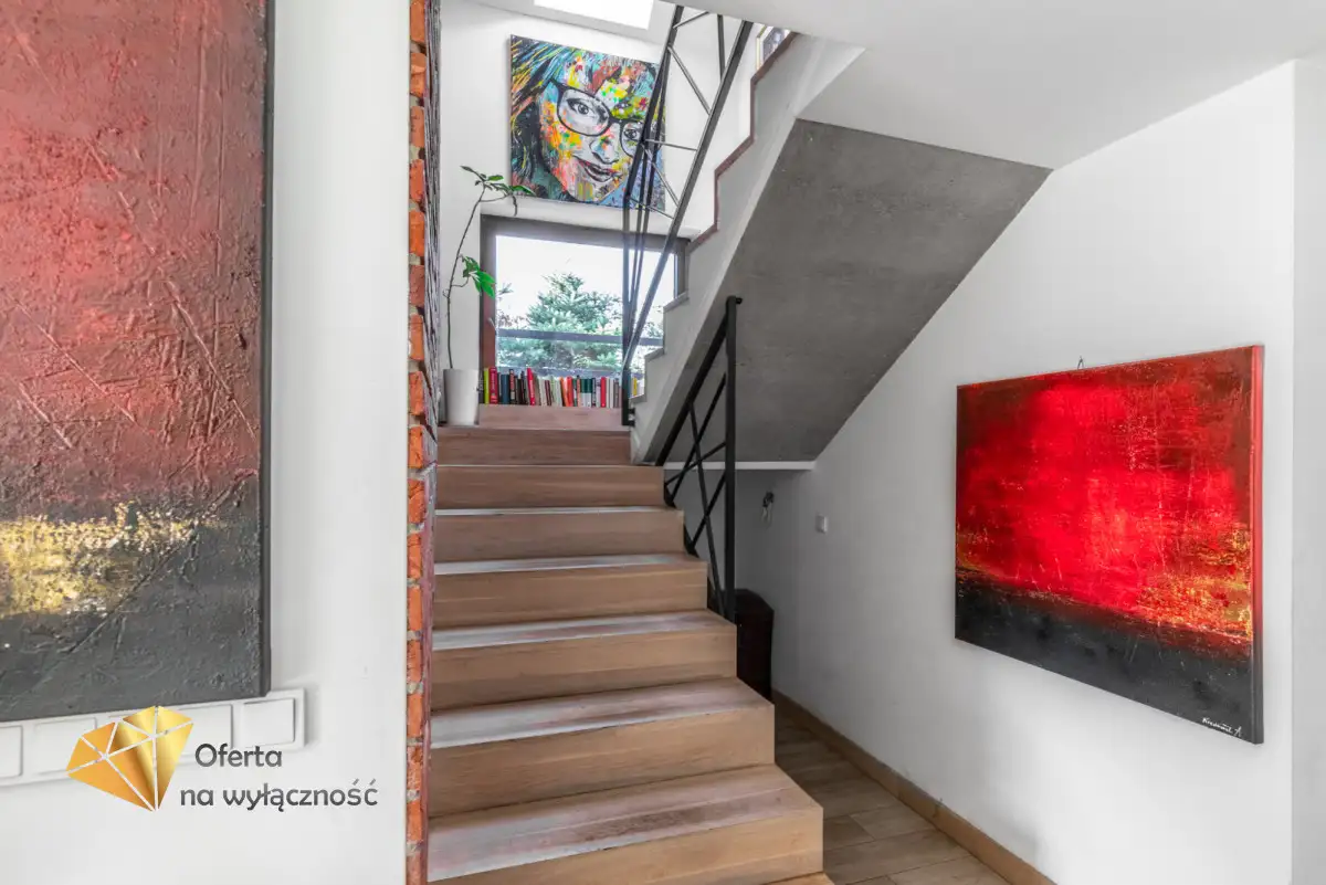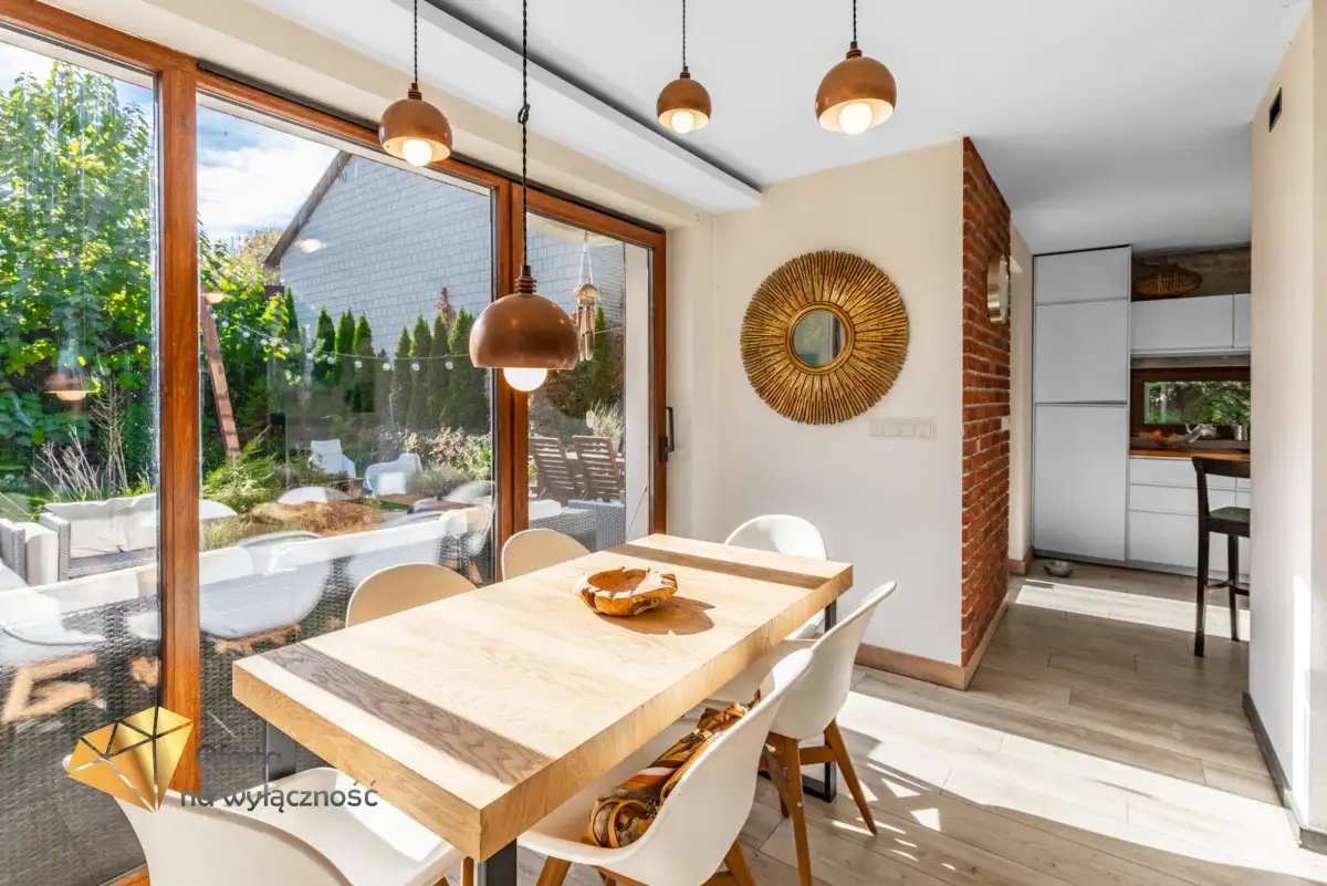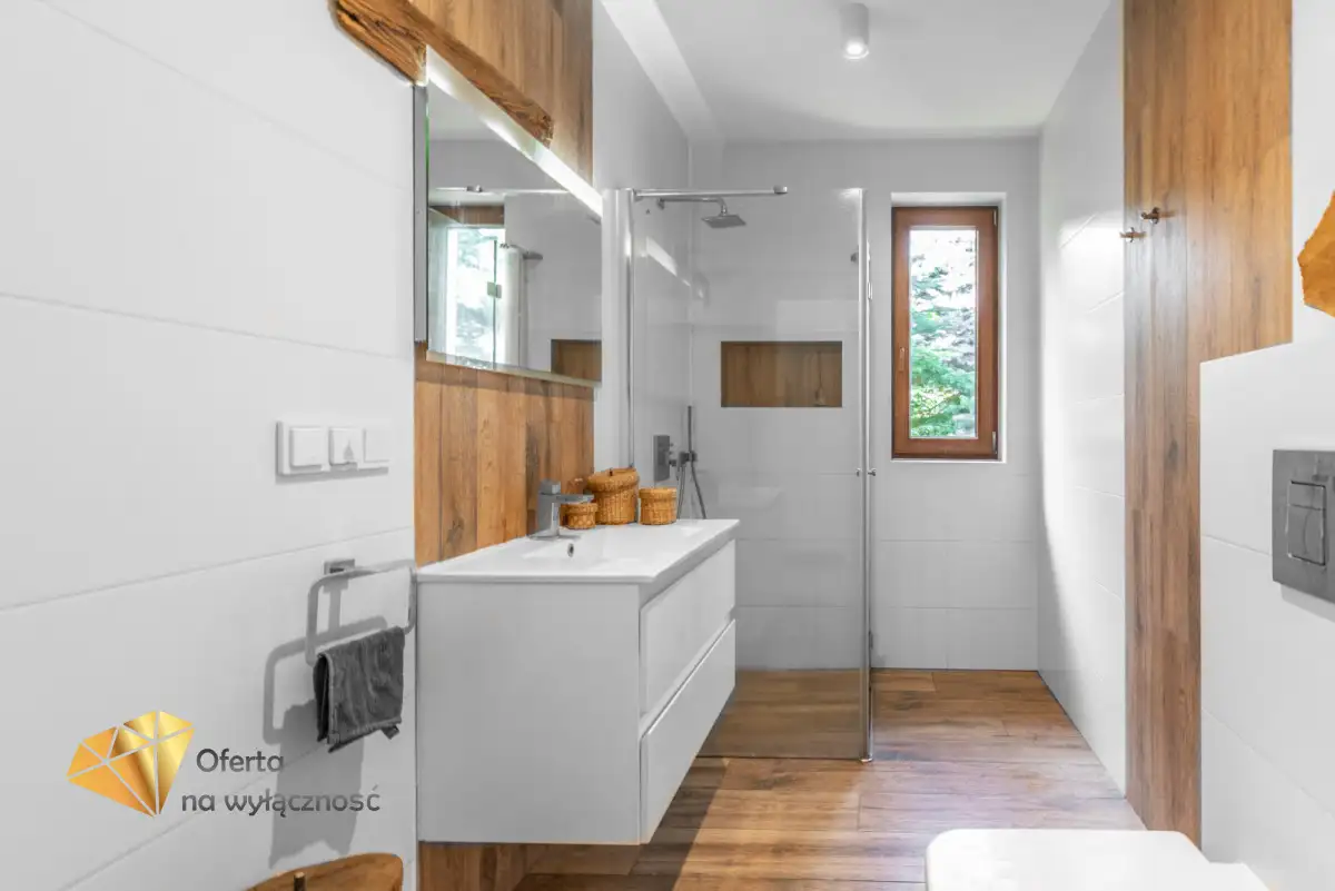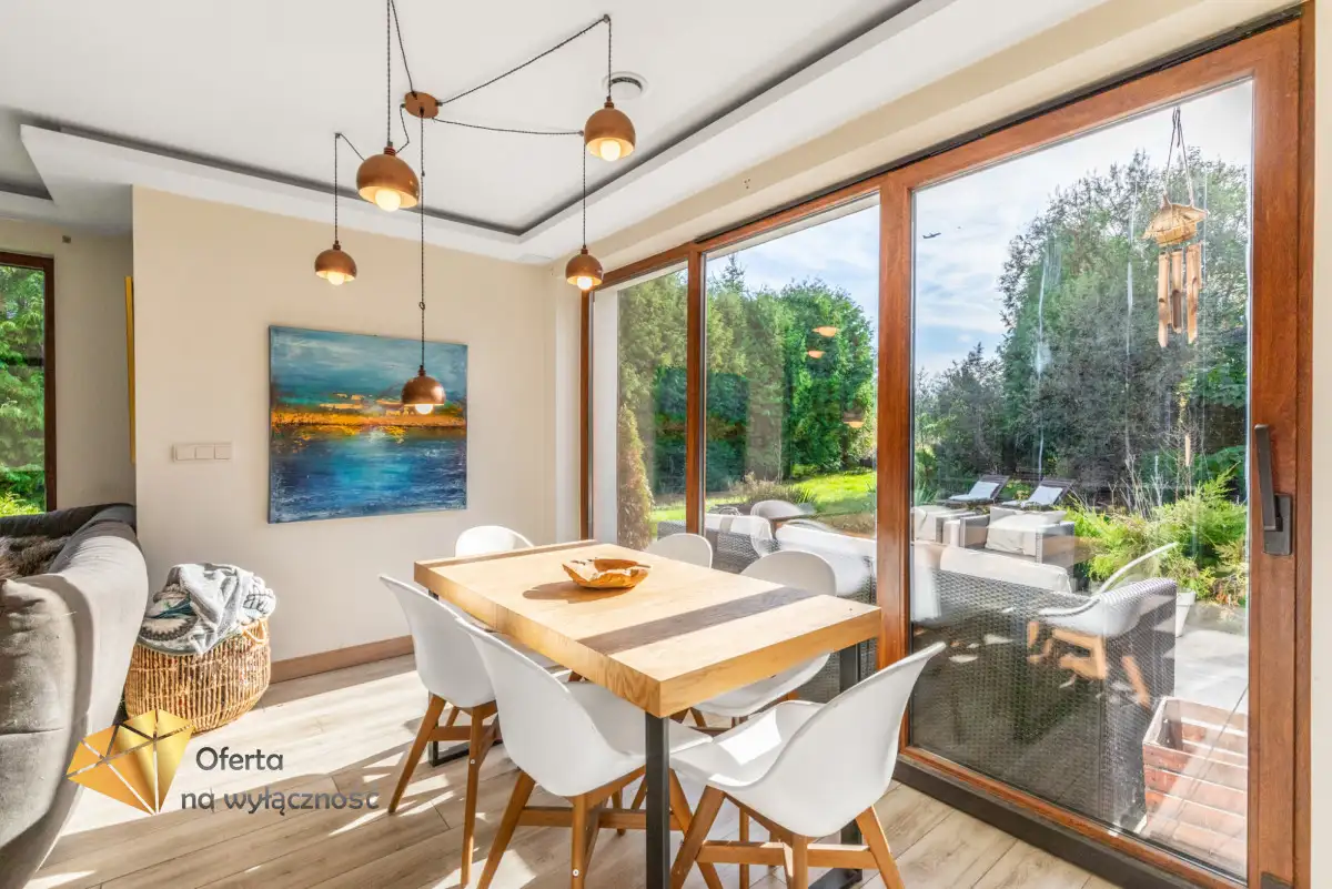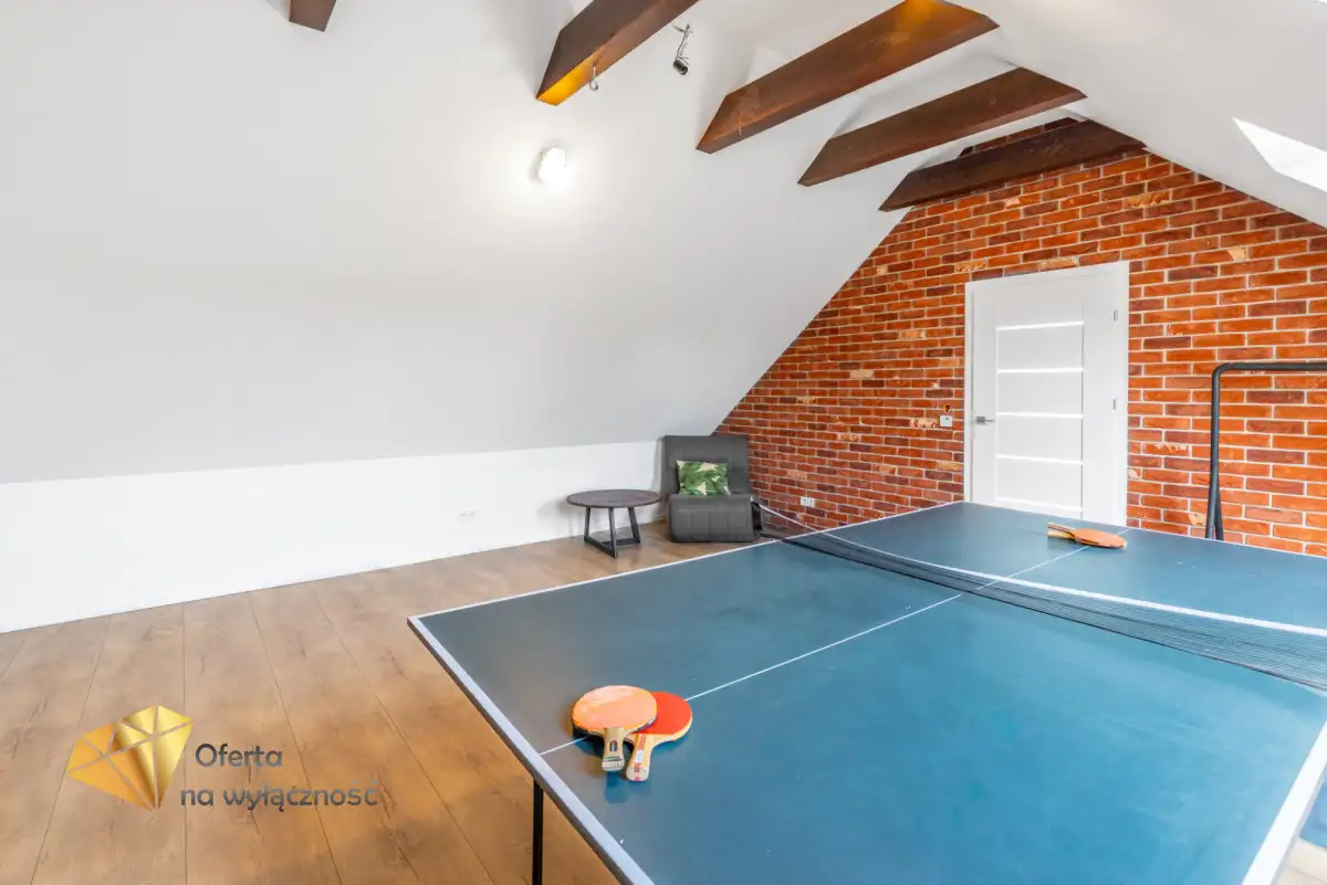 Sercem domu jest salon z tradycyjnym kominkiem i dużymi oknami, z którego roztacza się widok na ogród i zaprasza na taras, by tam delektować się świeżym powietrzem, śpiewem ptaków, słońcem. W części dziennej znajduje się również jadalnia i półotwarta, nowoczesna kuchnia. Na parterze znajdziemy też gabinet, łazienkę z prysznicem, kotłownię i wejście do garażu. Dodatkowym atutem nieruchomości jest pomieszczenie z oddzielnym wejściem, które może być przeznaczone jako pokój dla gości lub pod prowadzenie działalności gospodarczej.