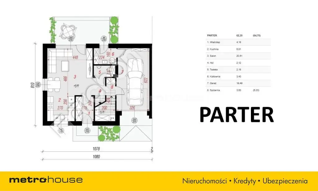 - Parter (ok. 62 m²): wiatrołap, kuchnia, spiżarnia, salon z jadalnią, hol, toaleta, kotłownia, garaż.