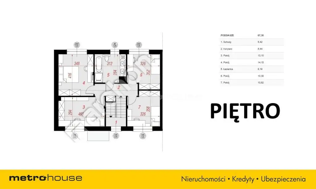 - Poddasze (ok. 67 m²): korytarz, 4 pokoje, łazienka.
