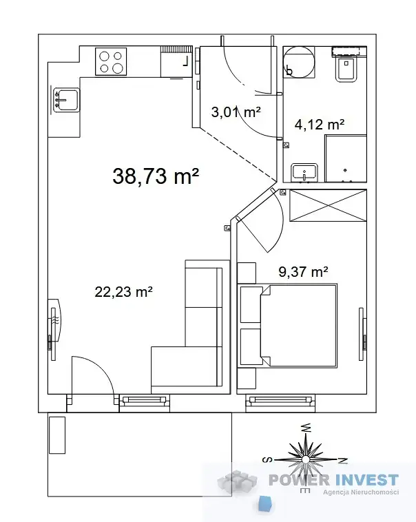 Mieszkanie znajduje się na 1 piętrze. Lokal ma powierzchnię 38,73 m powierzchni użytkowej i składa się z: