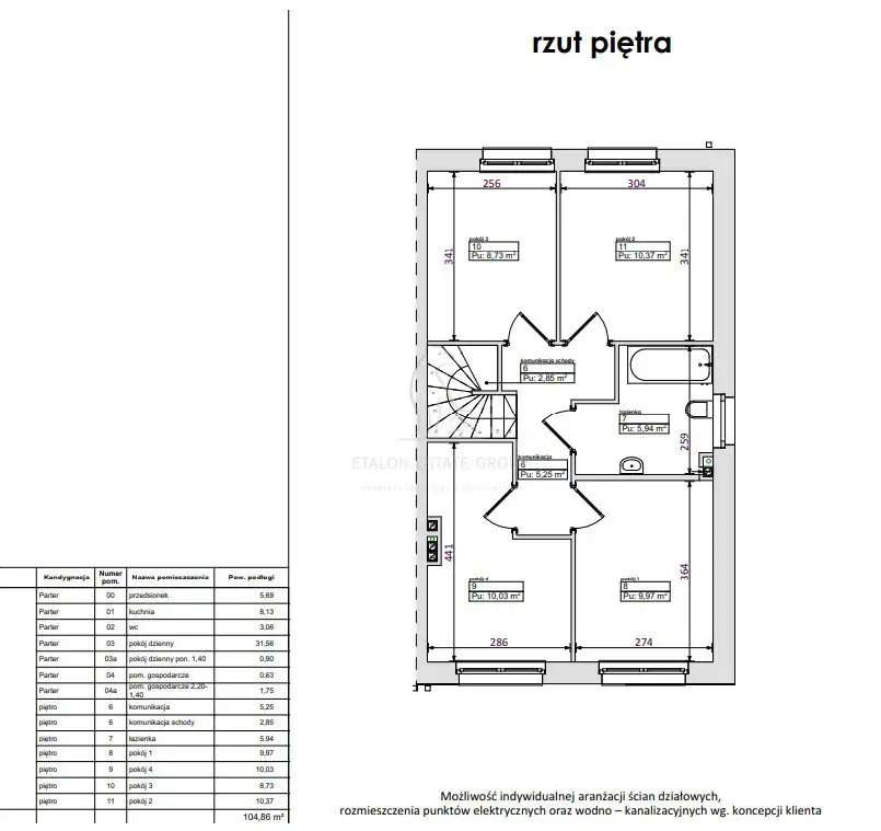Domy cztero- i pięciopokojowe, o powierzchni od 85,23 m² do 104,86 m², zaprojektowane z myślą o maksymalnym wykorzystaniu przestrzeni. Układ pomieszczeń uwzględnia otwartą przestrzeń dzienną, jasne sypialnie oraz praktyczne rozwiązania architektoniczne.