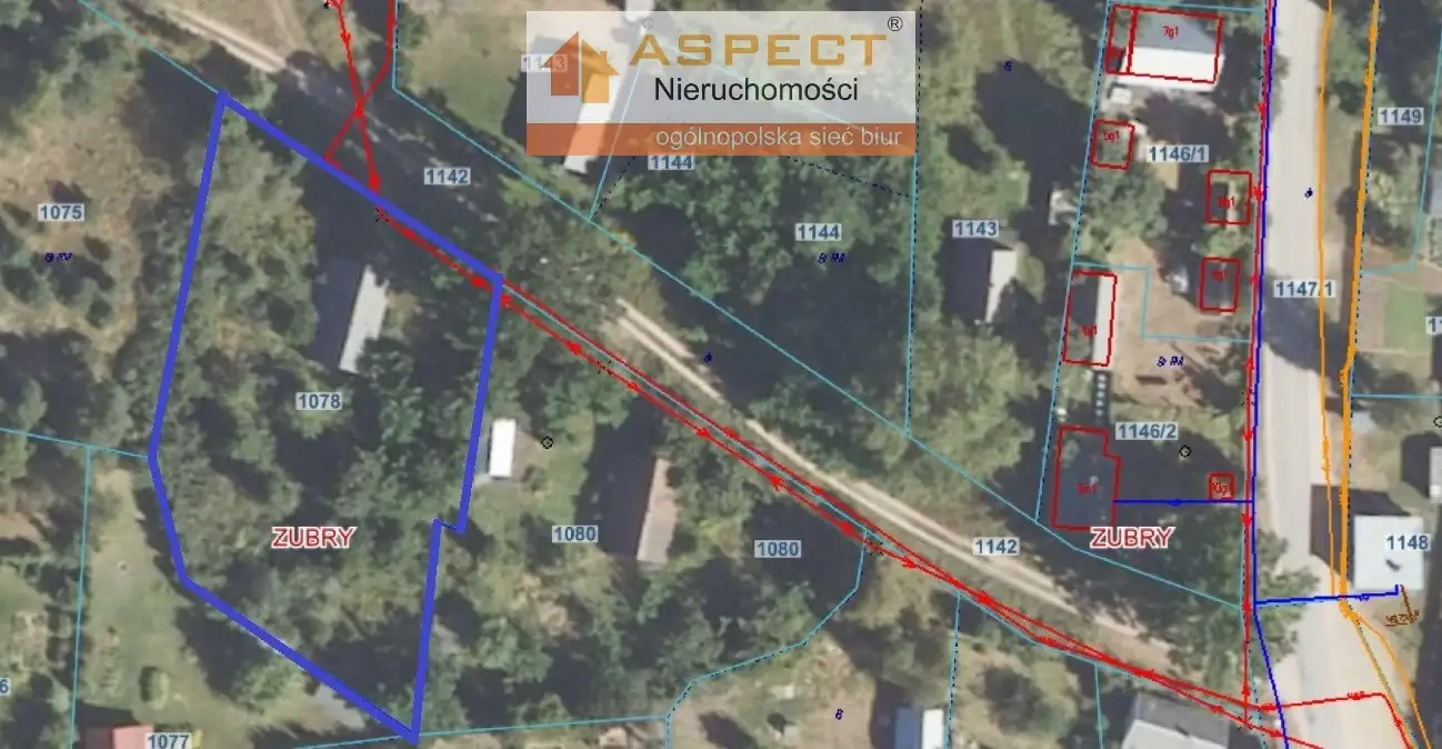 Działka budowlana o kształcie zbliżonym do trapeza o orientacyjnych wymiarach 40,0 m x 52,0 m (1965m²) na końcu wsi Zubry.