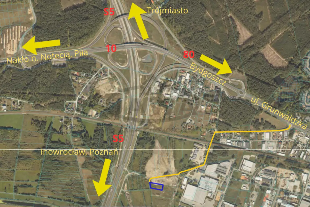 Działka znajduje się w strefie produkcyjno-usługowej części miasta. Bliskość infrastruktury przemysłowej i dobry dojazd czynią to miejsce idealnym pod działalność gospodarczą. Ponad to nieruchomośc znajduje się blisko węzła komunikacyjnego, na którym możemy kierować się w stronę Bydgoszczy, Nakła n. Notecią i Piły, Trójmiasta, Inowrocławia i Poznania.