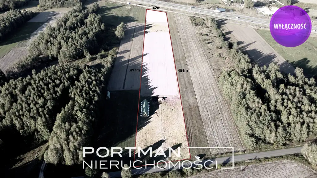 Teren posiada dostęp z drogi serwisowej trasy S17 oraz drogi gminnej (asfaltowy). Wymiary: 44m x 470m. Media: prąd w ulicy (od strony drogi serwisowej), woda miejsca 200 metrów (od strony drogi gminnej).