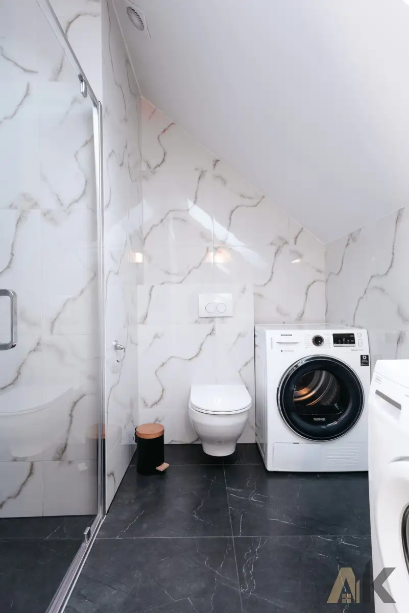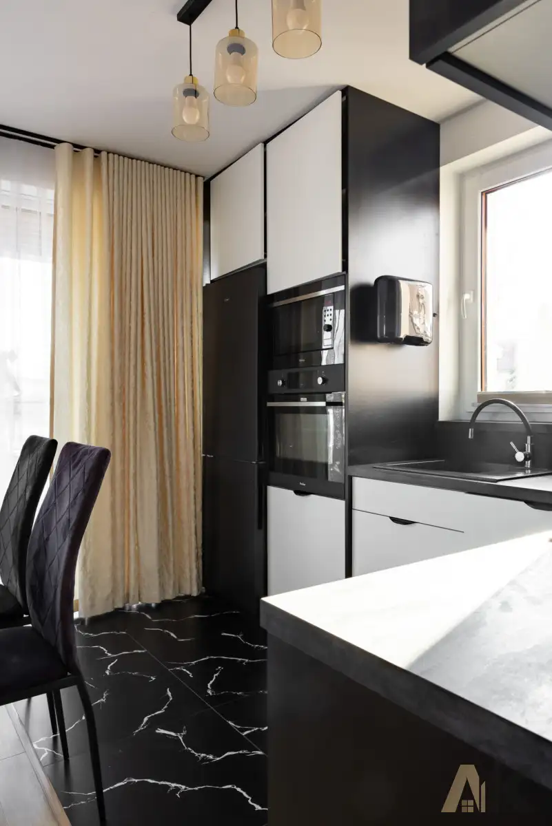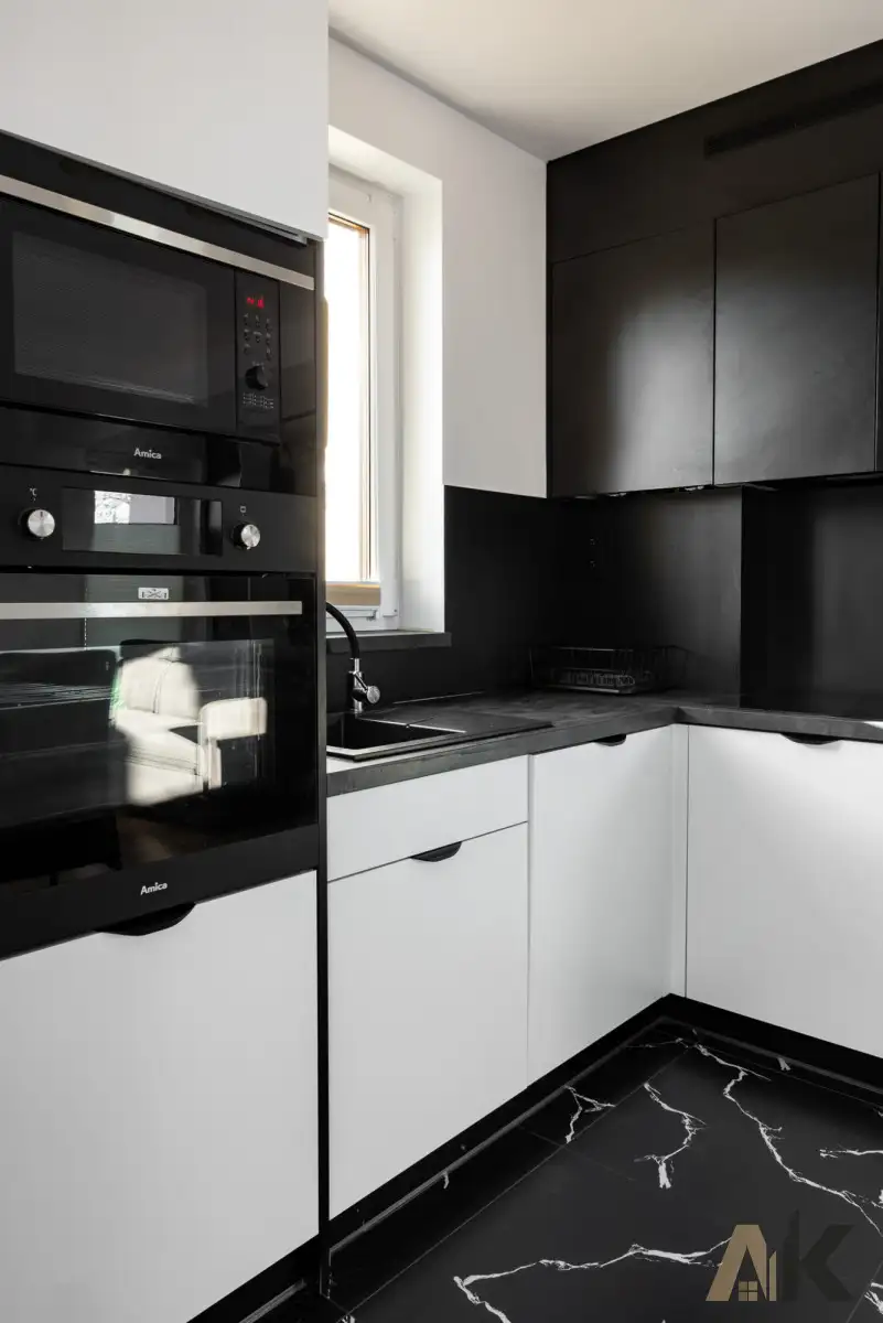 Kuchnia została w pełni wyposażona w zabudowę oraz sprzęty AGD - lodówkę, zmywarkę, płytę indukcyjną, piekarnik, okap, zlewozmywak, pralkę oraz suszarkę — wszystko, czego potrzeba do wygodnego funkcjonowania.