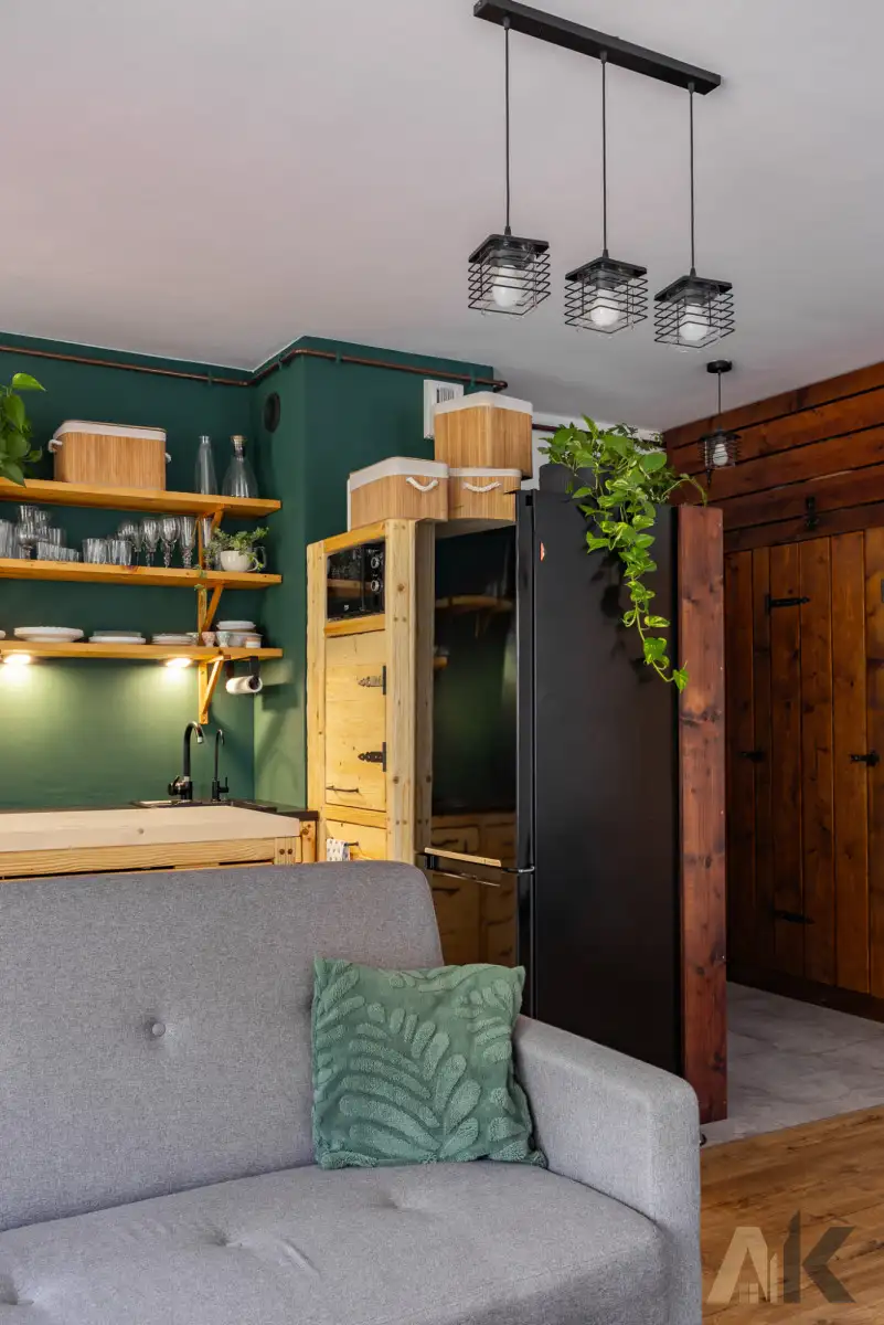 -pokój dzienny z otwartą dobrze doposażoną kuchnią