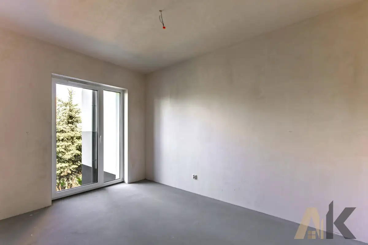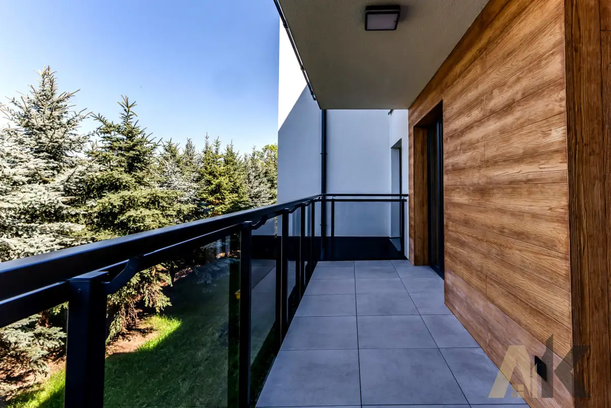 Z salonu wyjście na przestronny balkon, z której rozpościera się widok na otaczającą zieleń. Duże okna balkonowe w każdym pomieszczeniu zapewniają świetne doświetlenie wnętrz przez cały dzień.