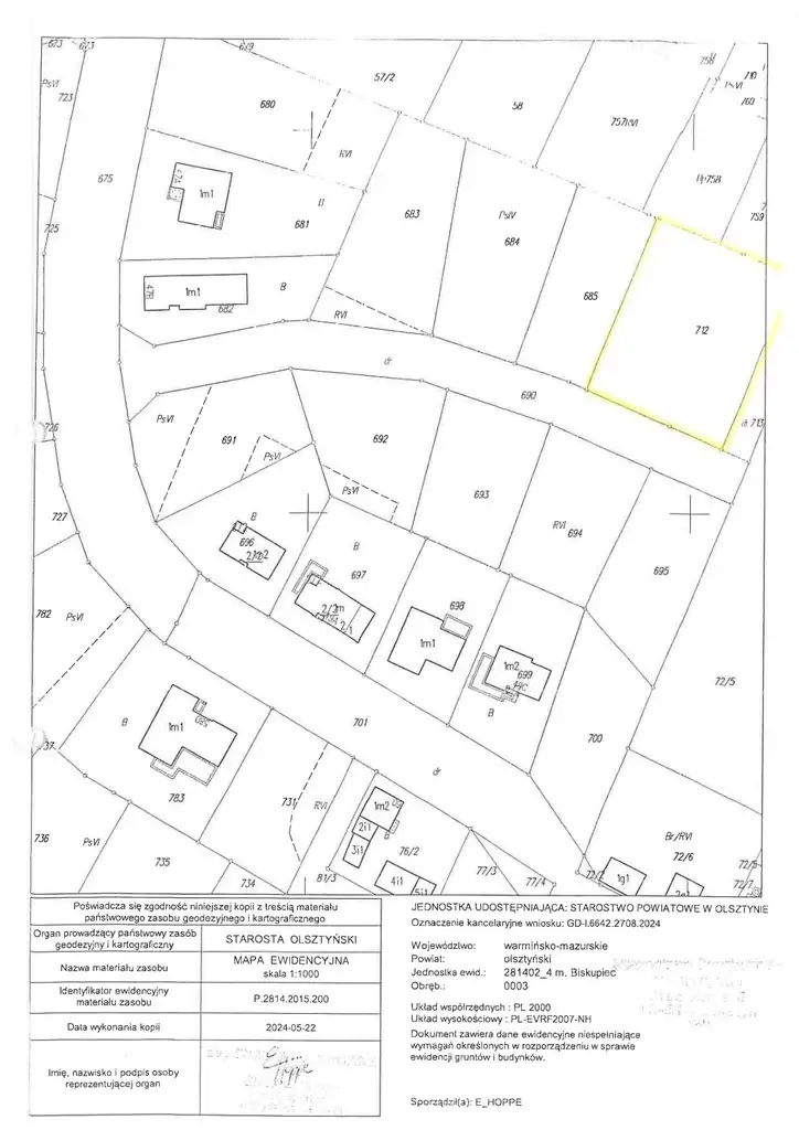 Nieruchomość położona w Biskupcu przy ul. Skauta (obręb miasto Biskupiec 3), dla której prowadzona jest księga wieczysta nr OL1B/00012161/3, oznaczona numerem działki 712 o powierzchni 0,1863 ha.