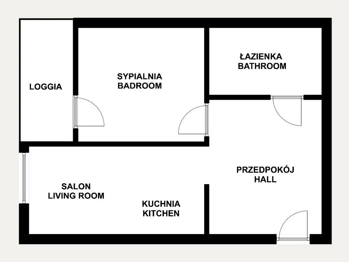 Pokoje: Sypialnia, salon, otwarta kuchnia, przedpokój, łazienka, balkon typu loggia