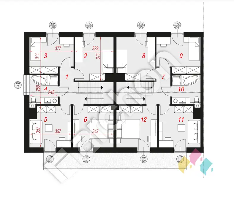 - 4 oddzielne sypialnie (10,66 m², 11,46 m², 11,72 m², 12,10 m²)