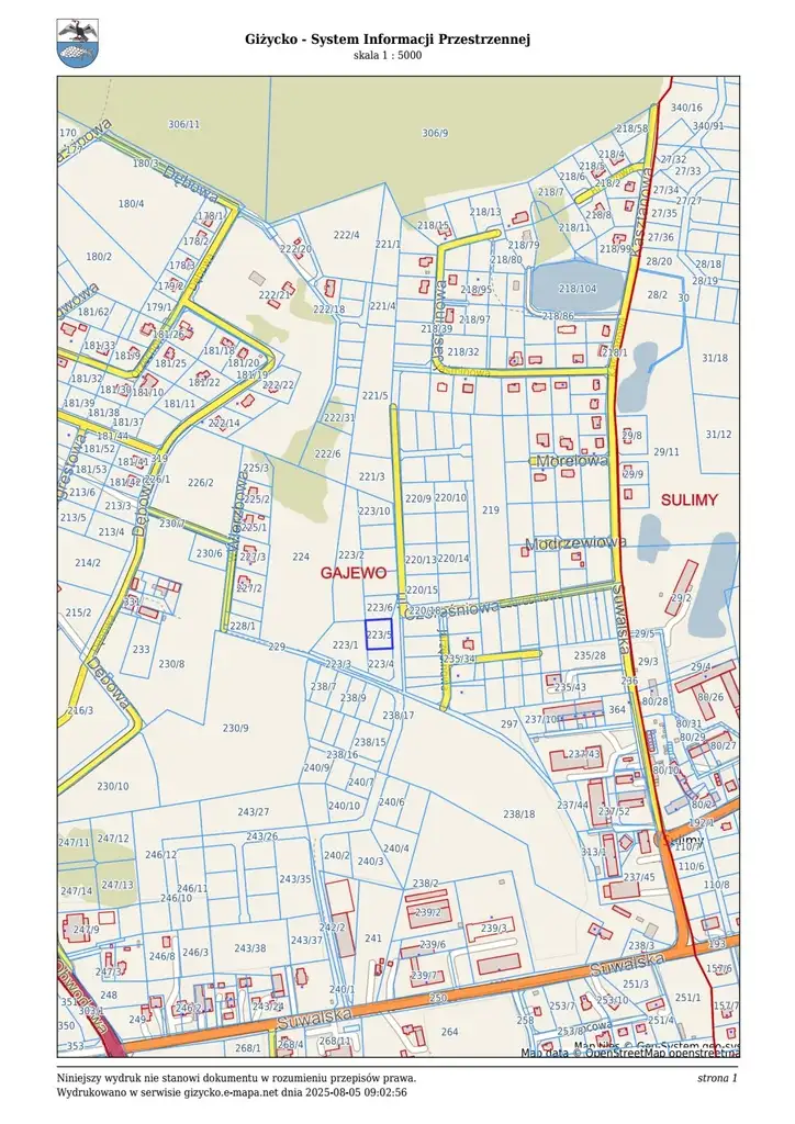 1) 223/5 o powierzchni 0,1315 ha, położona w miejscowości Gajewo, obręb geodezyjny Gajewo, gmina Giżycko dla której Sąd Rejonowy w Giżycku prowadzi księgę wieczystą OL1G/00016906/1. Wg ewidencji Gruntów i Budynków Starostwa Powiatowego w Giżycku działka oznaczona jest symbolem: RIVa – grunty orne, N - nieużytek.