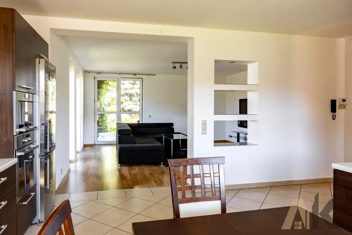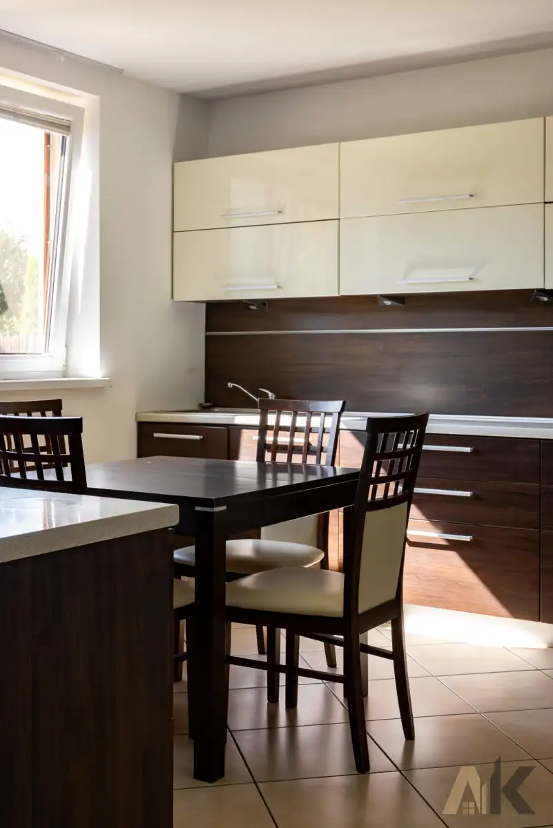 • Kuchnia w formie aneksu - jasna, w pełni wyposażona w sprzęt AGD (lodówka, piekarnik, zmywarka, płyta indukcyjna, okap)