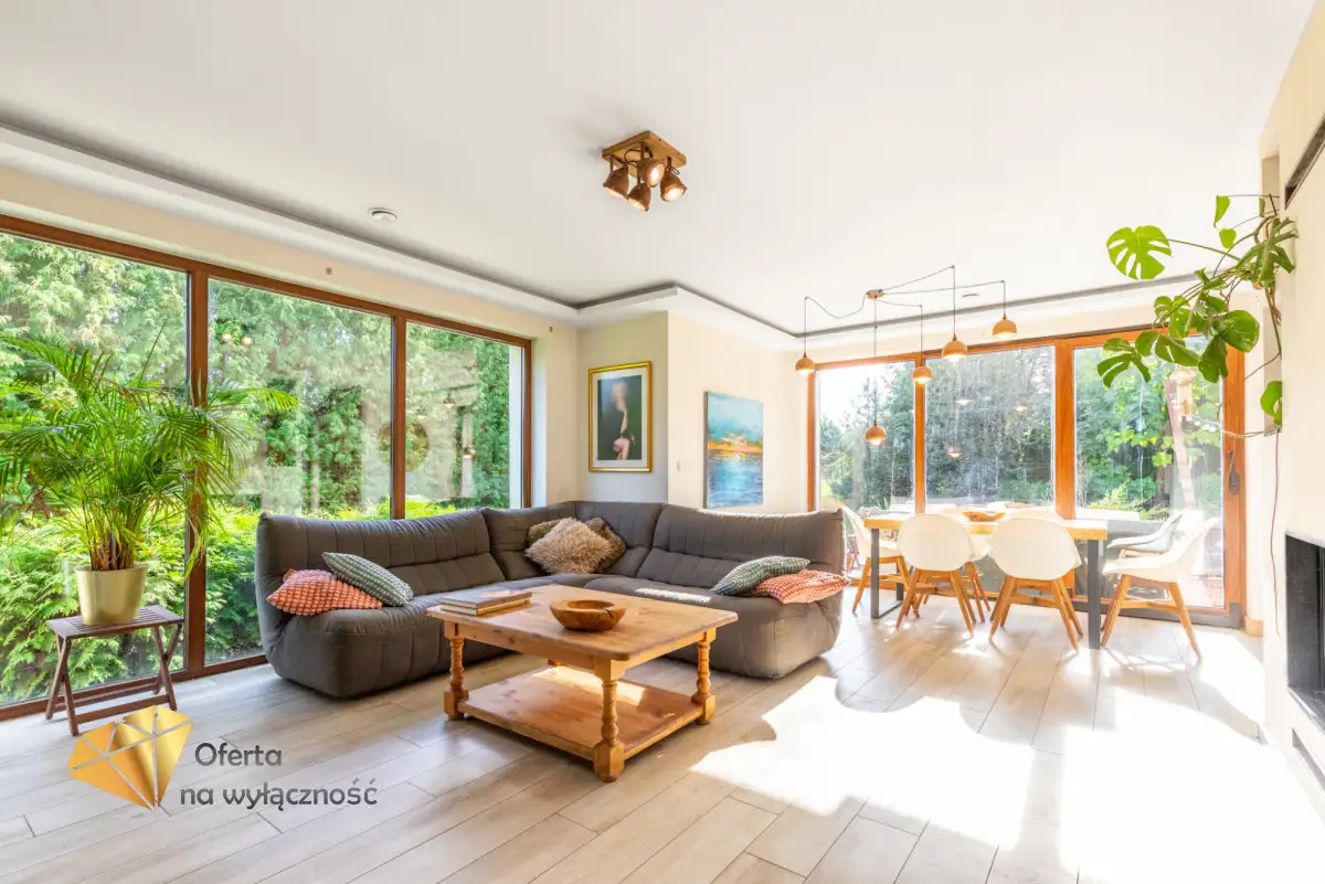 Sercem domu jest salon z tradycyjnym kominkiem i dużymi oknami, z którego roztacza się widok na ogród i zaprasza na taras, by tam delektować się świeżym powietrzem, śpiewem ptaków, słońcem. W części dziennej znajduje się również jadalnia i półotwarta, nowoczesna kuchnia. Na parterze znajdziemy też gabinet, łazienkę z prysznicem, kotłownię i wejście do garażu. Dodatkowym atutem nieruchomości jest pomieszczenie z oddzielnym wejściem, które może być przeznaczone jako pokój dla gości lub pod prowadzenie działalności gospodarczej.