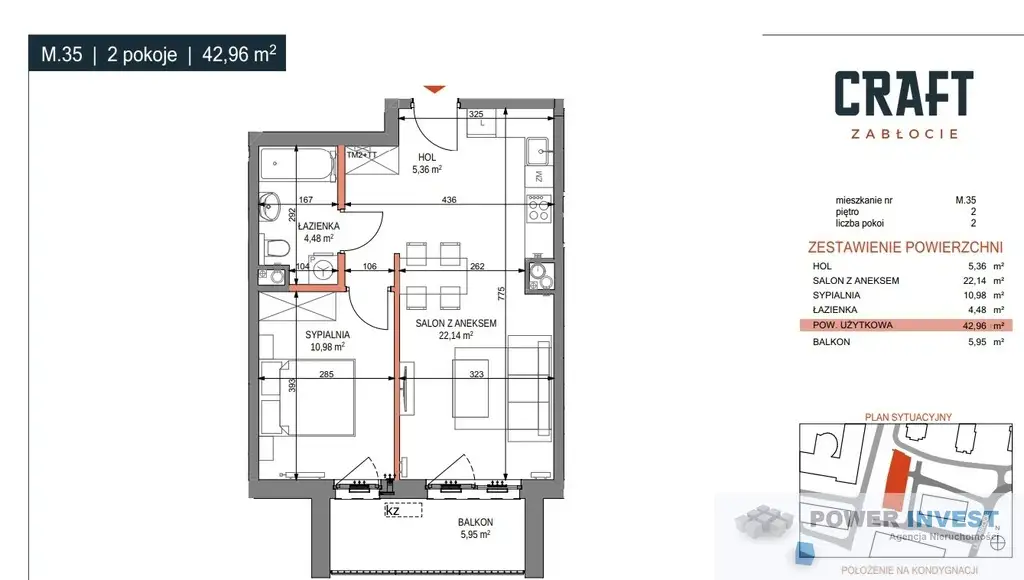 – dwupokojowe mieszkanie o powierzchni 42,96 m² z balkonem o powierzchni 5,95 m², usytuowane na trzecim piętrze