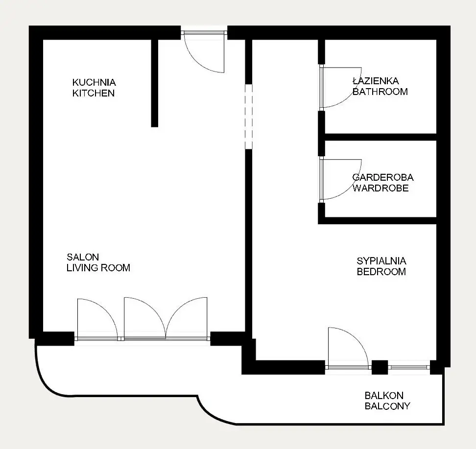 Pokoje: duży salon, kuchnia, łazienka, garderoba, sypialnia, duży balkon