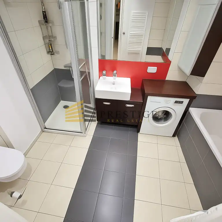 Przestronna łazienka z wanną, prysznicem, WC, pralką i szafkami.