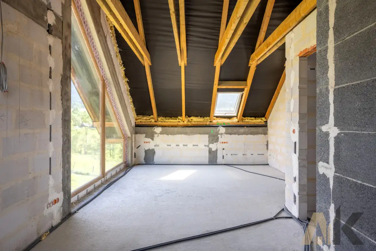 4 pokoje z prywatnymi łazienkami, korytarz z miejscem na aneks kuchenny, balkony z widokiem na las i góry