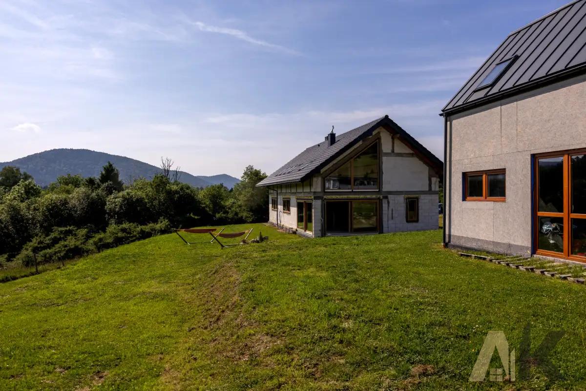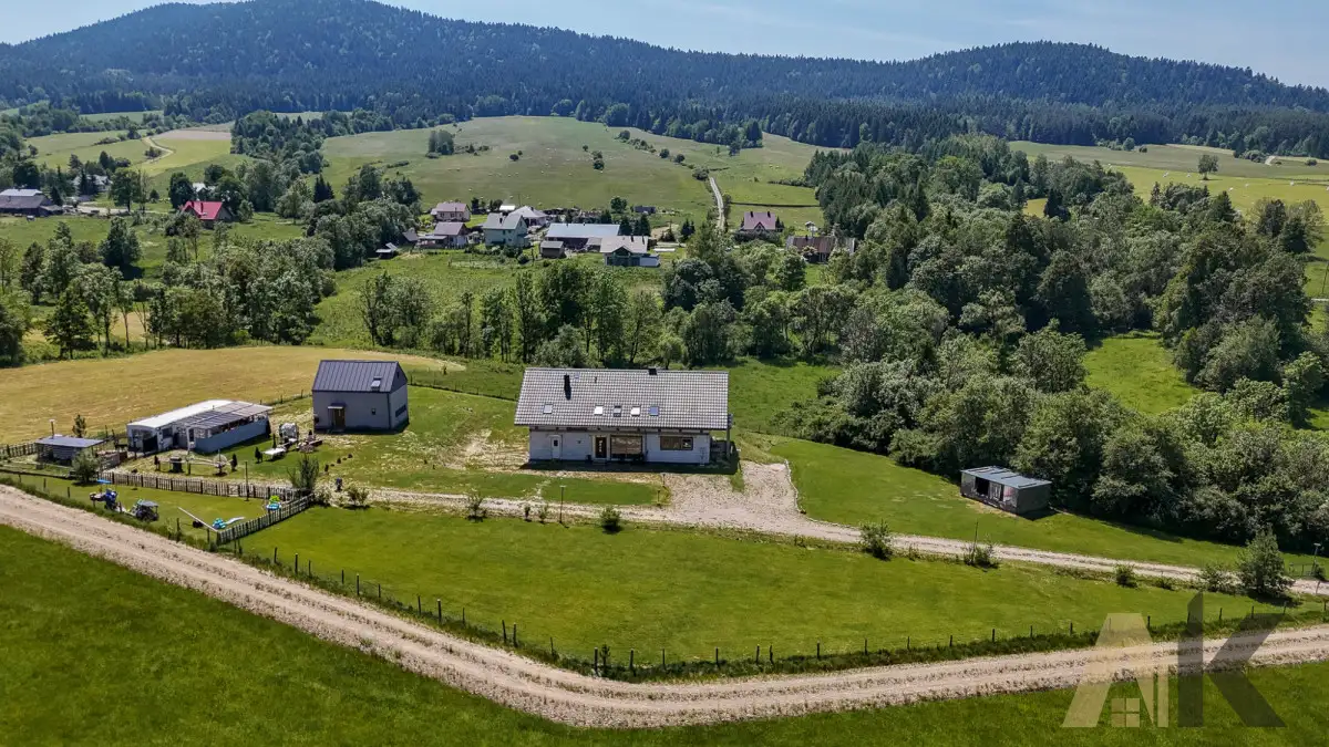 Gotowy do zamieszkania domek holenderski (30 m²) z tarasemGaraż dwustanowiskowyDziałka o powierzchni 1,25 ha z własnym potokiem i przepięknym widokiemTeren ogrodzony i przygotowany do dalszego zagospodarowania (ogród, strefa relaksu, altany, miejsce na ognisko)CHARAKTERYSTYKA DOMU GŁÓWNEGO:Część mieszkalna:Parter: wiatrołap, toaleta, przestronna kuchnia z jadalnią, salon z panoramicznymi oknami i wyjściem na taras z widokiem na strumień
