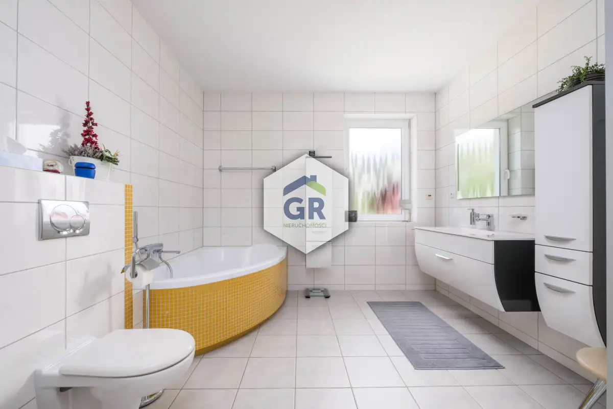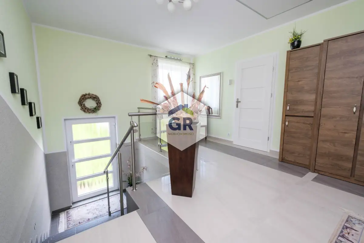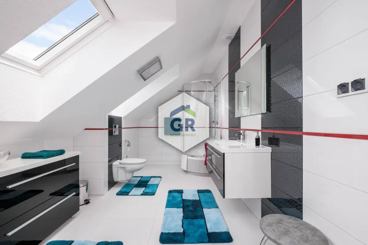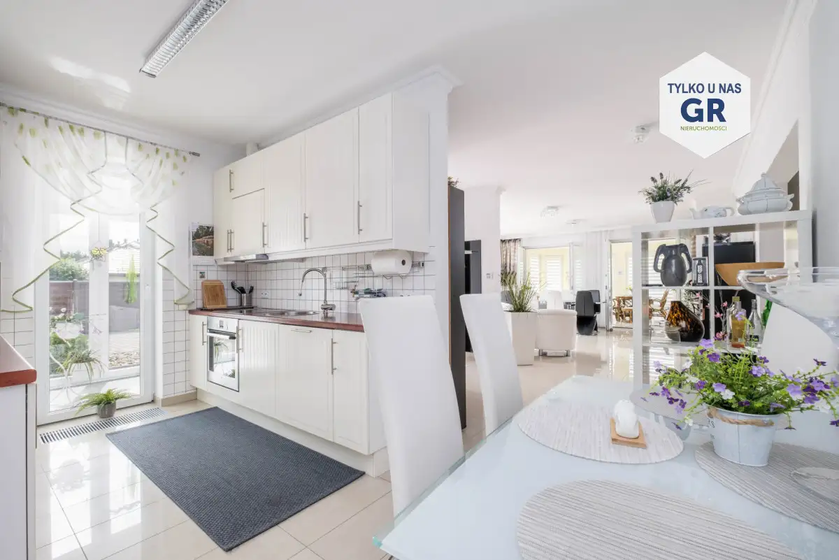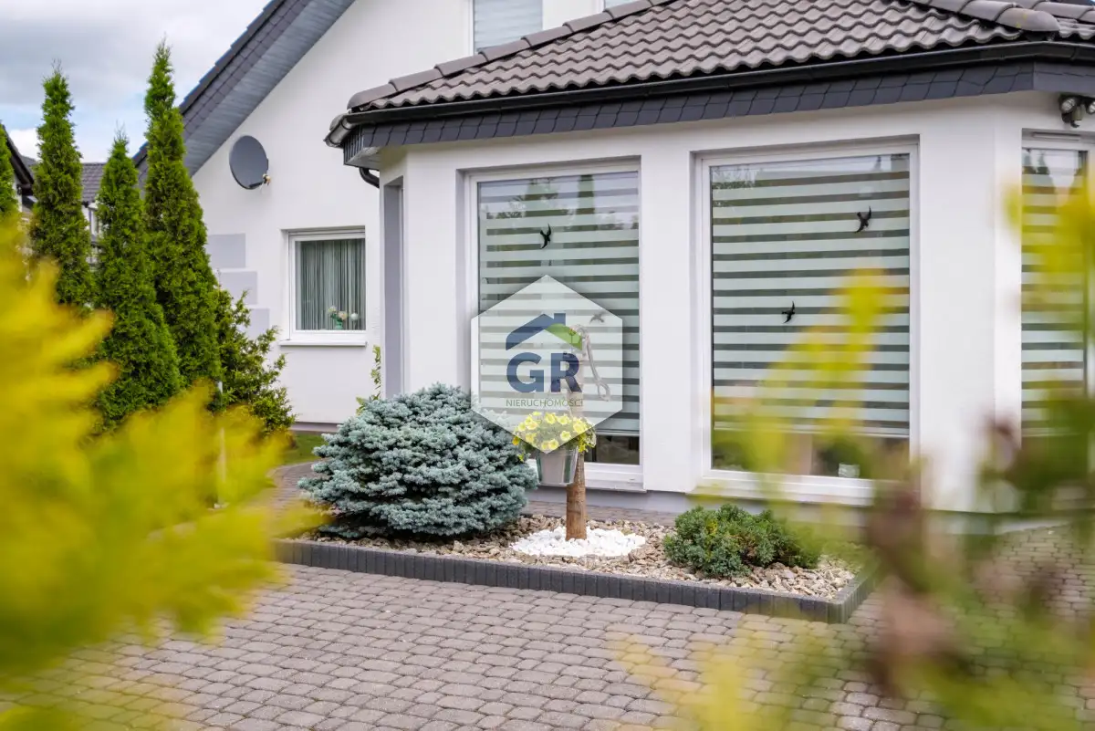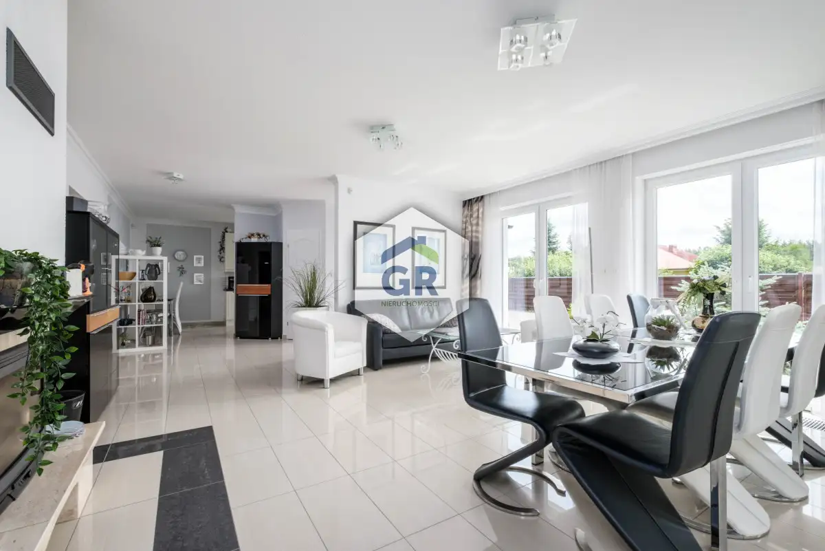 działce o powierzchni 1232 m². Nieruchomość jest gotowa do zamieszkania, wykończona w podwyższonym standardzie w nowoczesnym stylu.