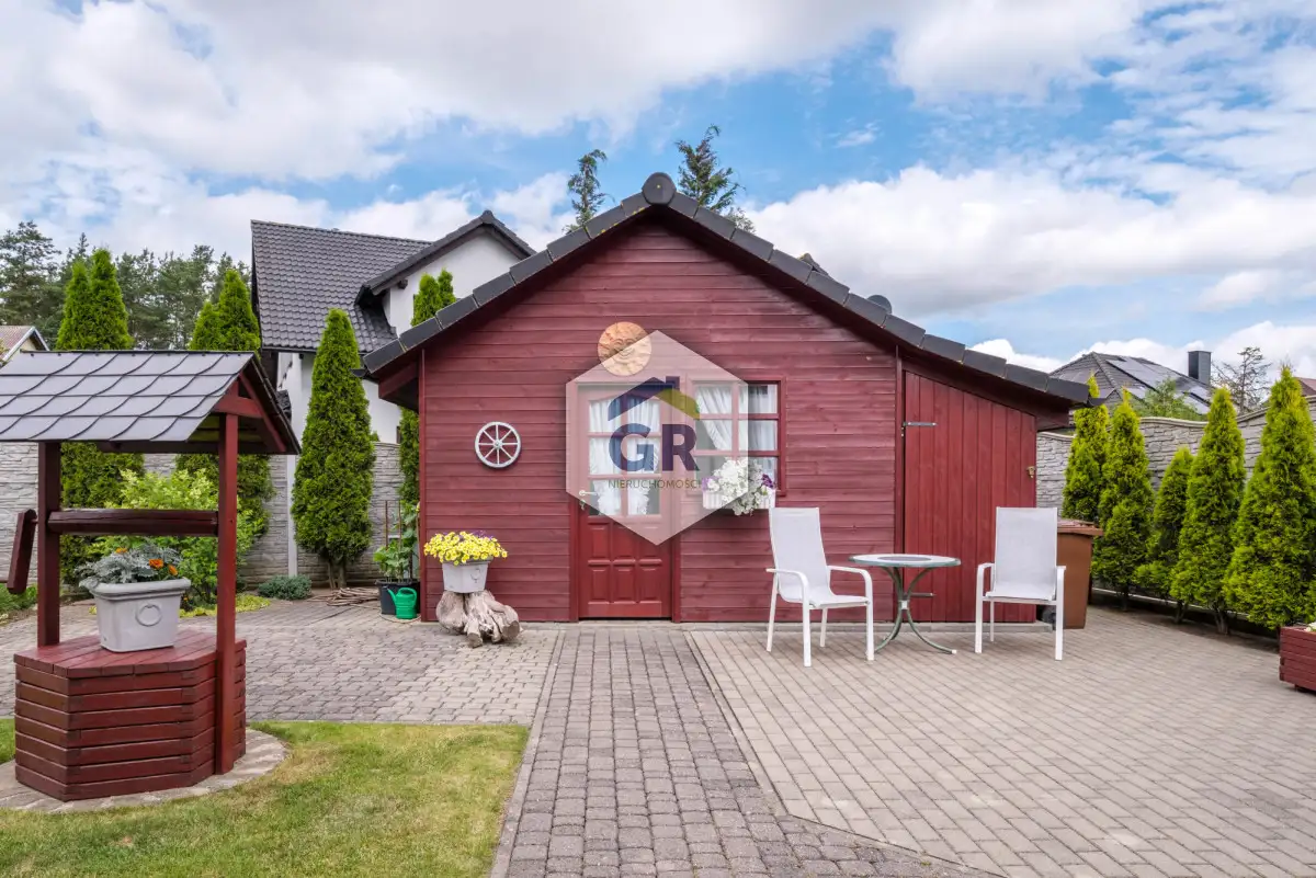 ogród zimowy (22,09 m²), który został zaadaptowany z tarasu. Pomieszczenie dzięki wysokim witrynom jest doskonale doświetlone. Z ogrodu zimowego poprzez drzwi tarasowe wychodzimy na ogród, który jest bardzo zadbany, a roślinność została w nim zaaranżowana w przemyślany sposób, tak aby zachować pełną prywatność. W ogrodzie przewidziano miejsce wypoczynku, znajduje się w nim również drewniana altana oraz drewniany budynek gospodarczy.