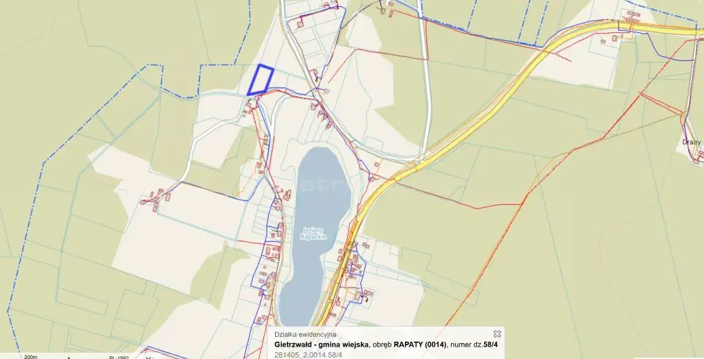 Do sprzedania działka w Rapatach (gmina Gietrzwałd) o wielkości 3020 mkw. Kształt zbliżony do prostokąta.