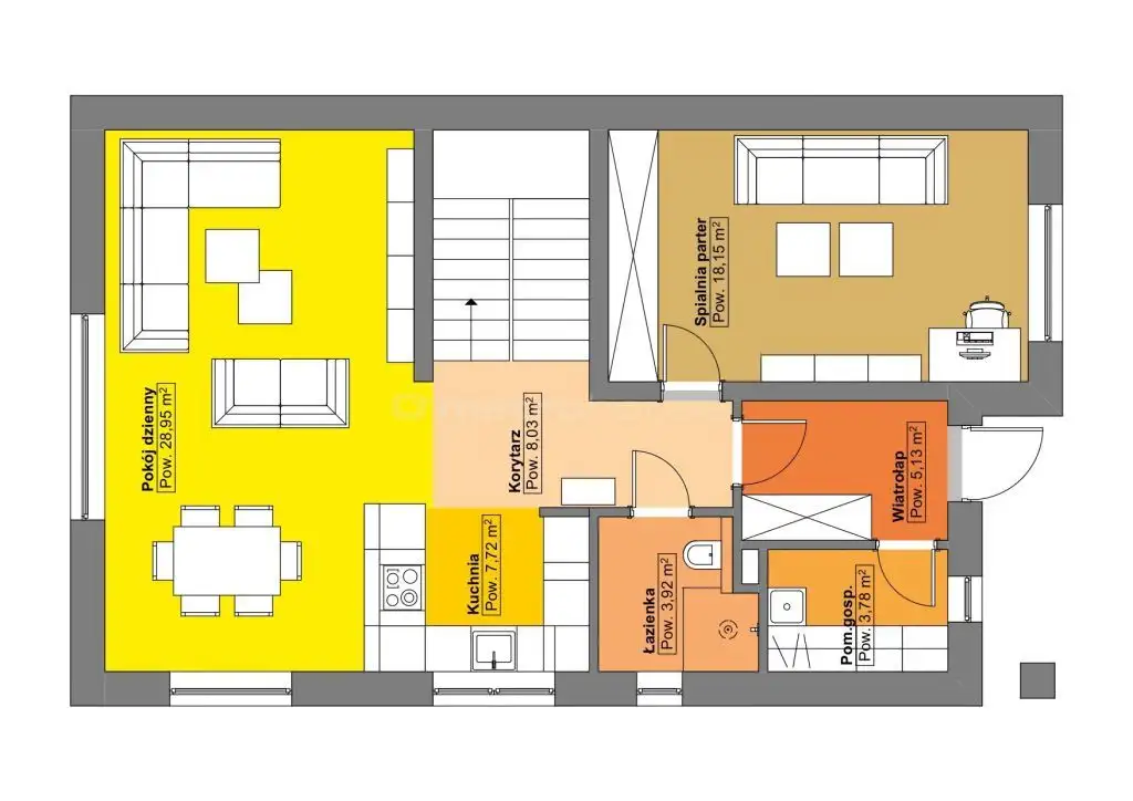 - Parter przestronny salon z jadalnią i kuchnią, wyjście na taras, łazienka, pomieszczenie gospodarcze, duży dodatkowy pokój (gabinet/usługi/sypialnia).