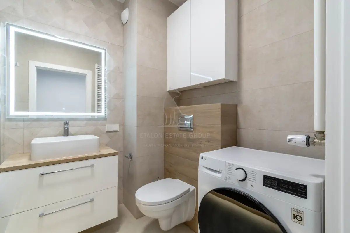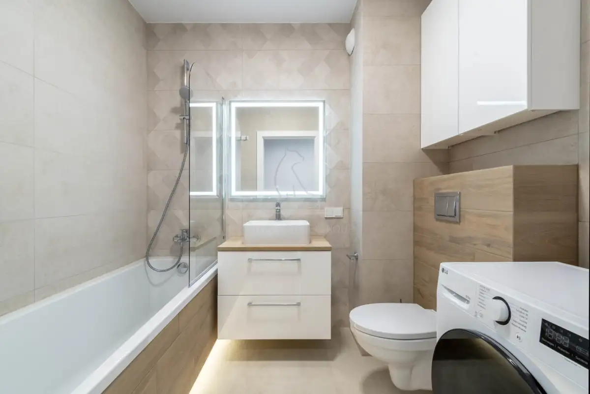 Łazienka z pełnym wyposażeniem, w tym z szafkami oraz pralko-suszarka.