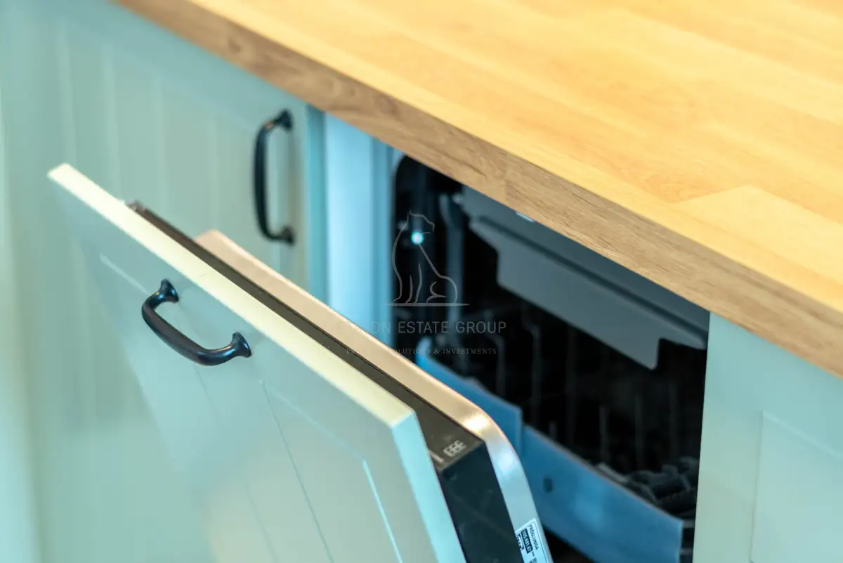 Kuchnia wyposażona w nowoczesną zabudowę meblową oraz kompletny sprzęt AGD (piekarnik, zmywarka, lodówka, płyta indukcyjna, okap).