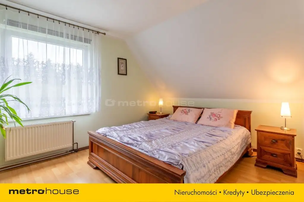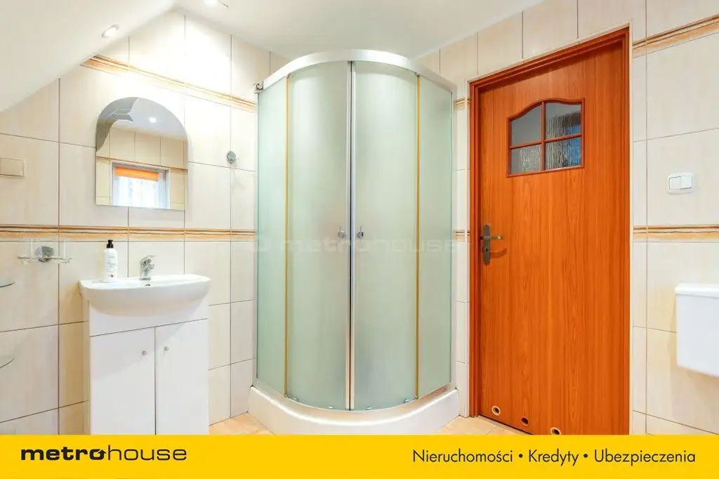 Na piętrze 3 sypialnie, 2 garderoby i łazienka z kabiną prysznicową.