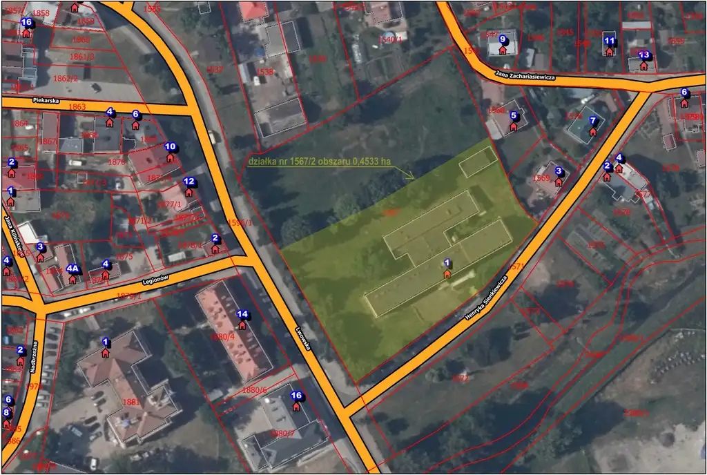 Działka nr 1567/2 zlokalizowana jest w strefie centralnej miasta Radymna, bezpośrednio przy ulicy Sienkiewicza w sąsiedztwie ulicy Lwowskiej. Działka ma foremny kształt, usytuowany jest na niej budynek dawnej szkoły oraz budynek gospodarczy. Dawny budynek dydaktyczny to obiekt wielobryłowy z częścią główną dwukondygnacyjną oraz elementami parterowymi stanowiącymi łącznik z zapleczem socjalno – administracyjnym. Budynek jest częściowo podpiwniczony, o konstrukcji tradycyjnej murowanej, wyposażony w media w sposób pełny.